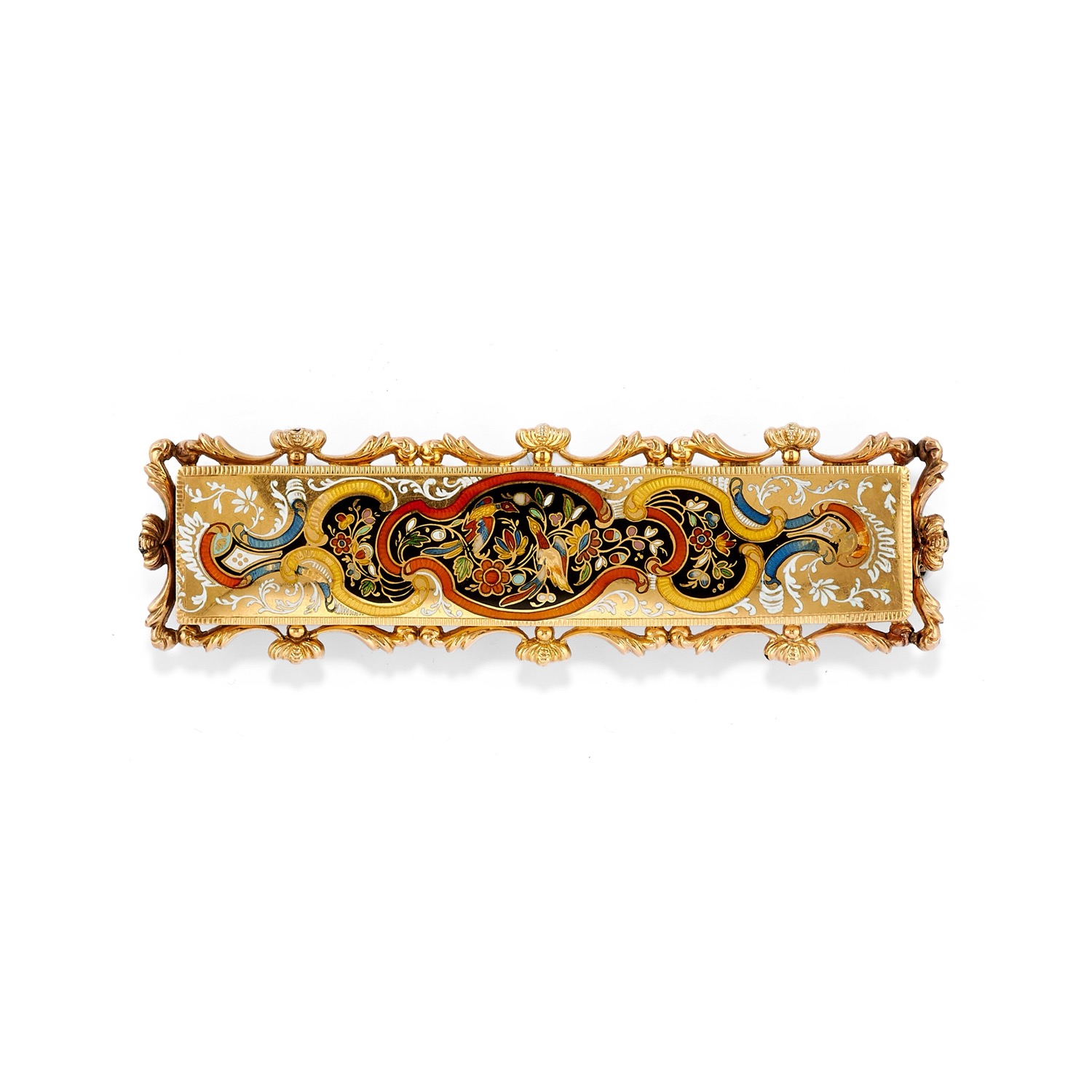 di forma rettangolare, con smalti policromi entro cornice traforata.