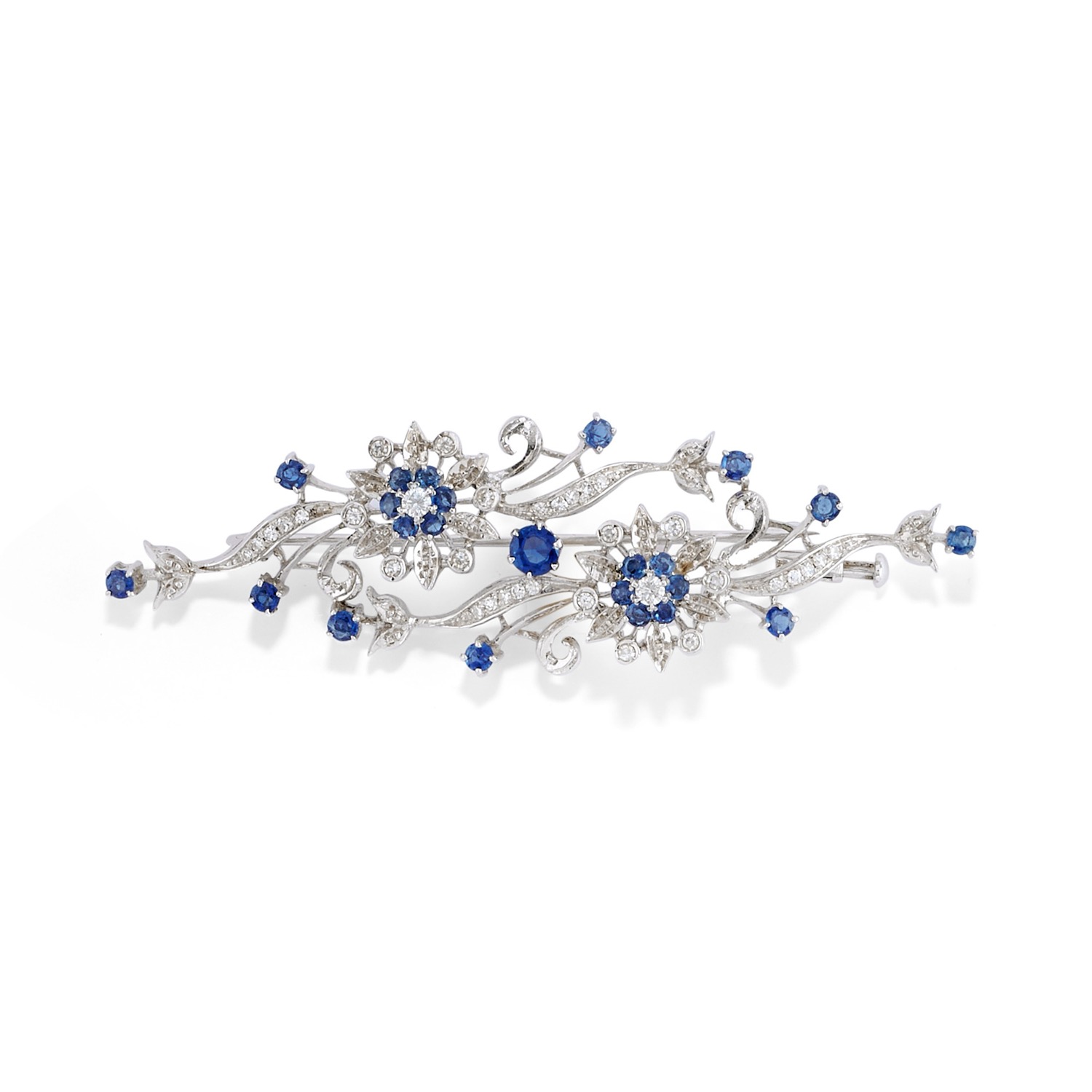 a tralcio fiorito, con zaffiri taglio rotondo per totale ct 0,40 circa e diamanti taglio brillante e huit-huit.