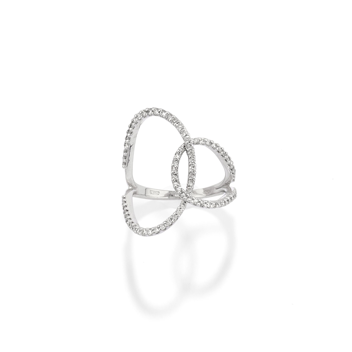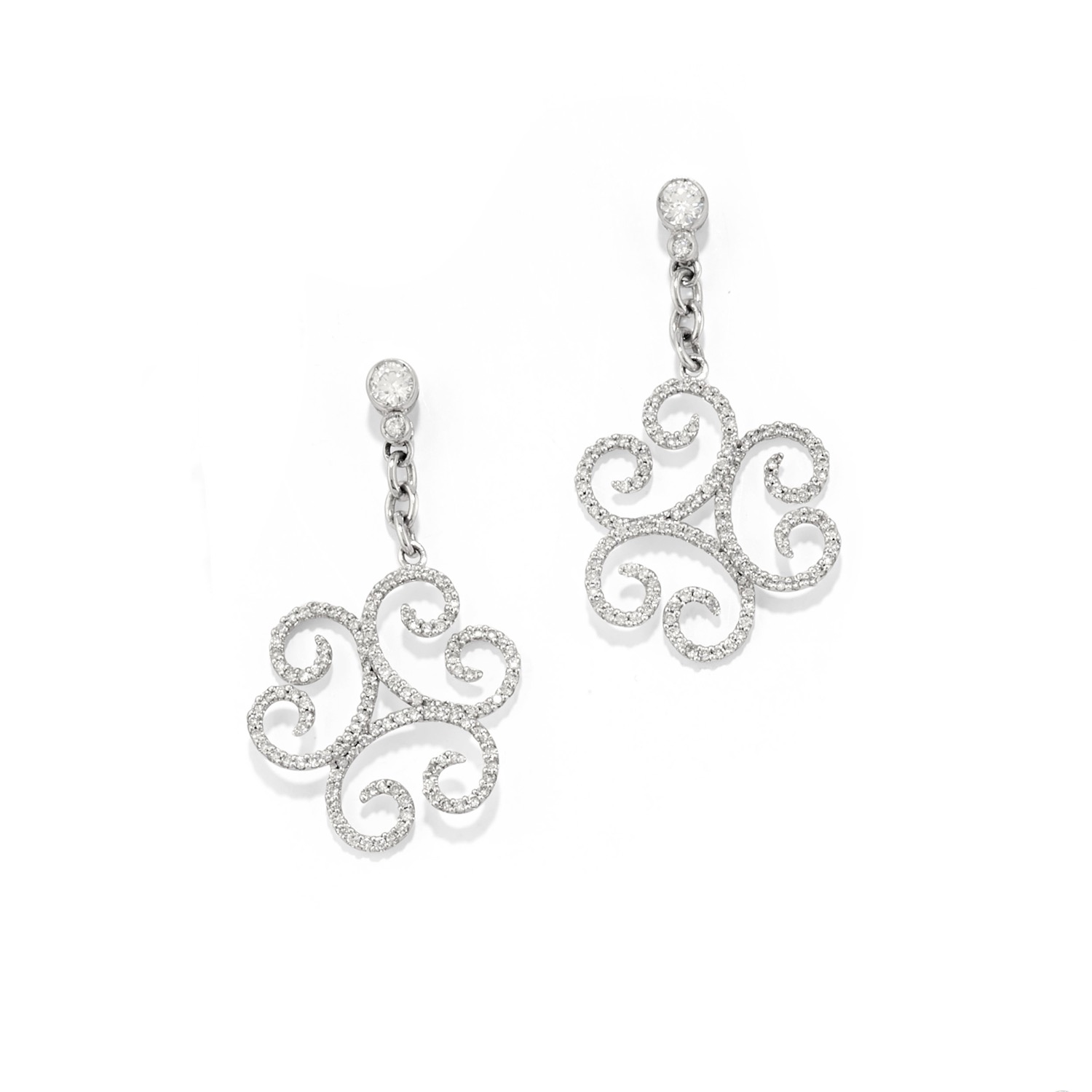 orecchini pendenti con motivi a volute con diamanti taglio brillante, chiusura a perno e farfalla, e anello a doppio nodo.