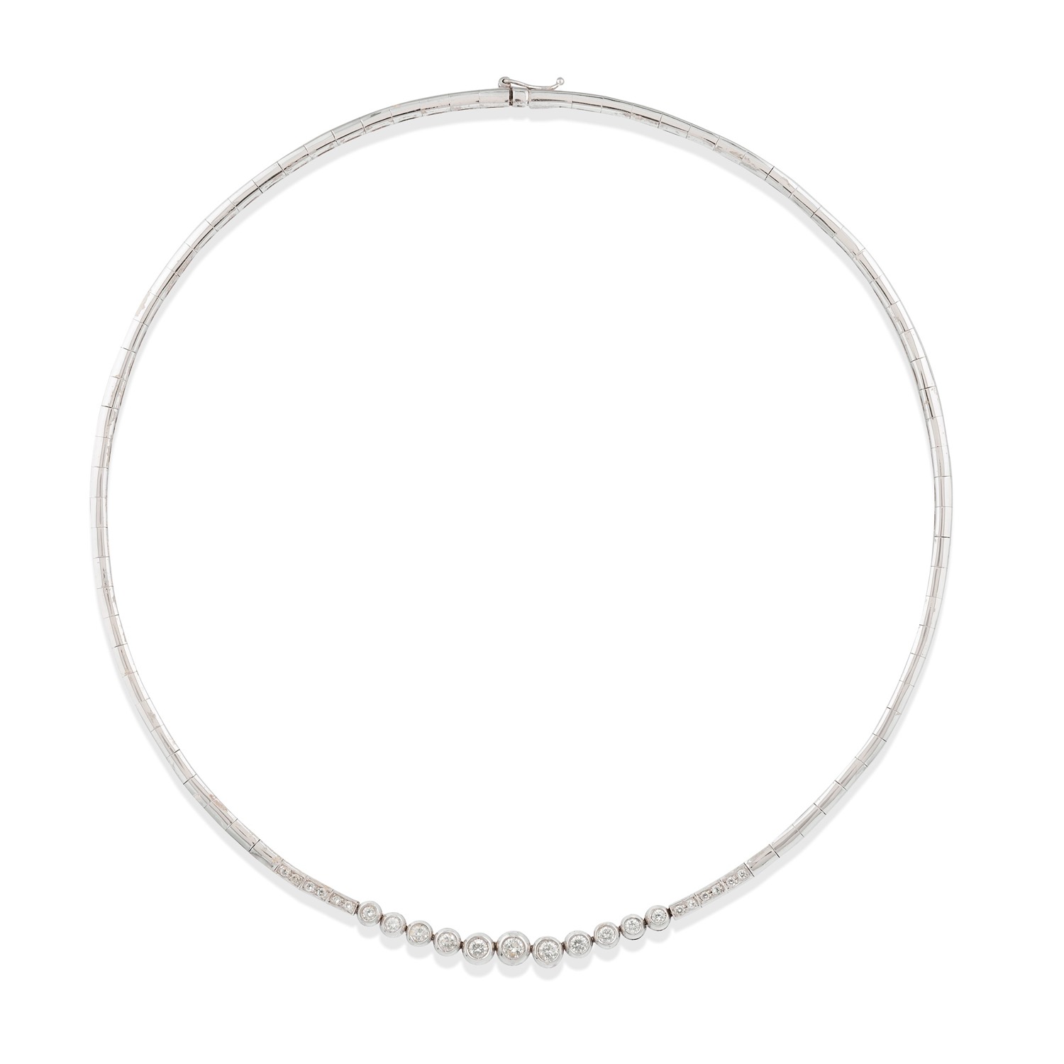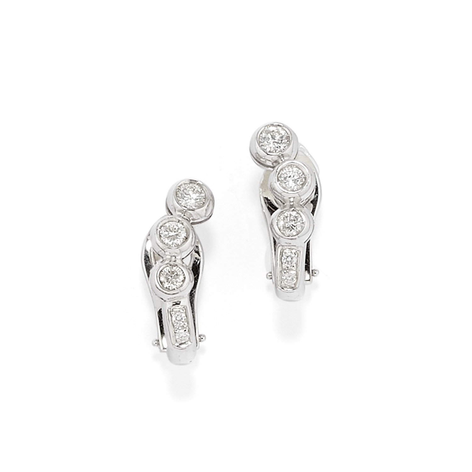 composta da collana a girocollo e coppia di orecchini, con castoni in diamanti taglio brillante per totale ct 1,00 circa, chiusura a perno e clip.