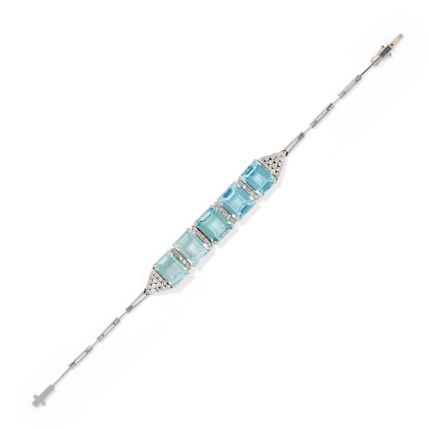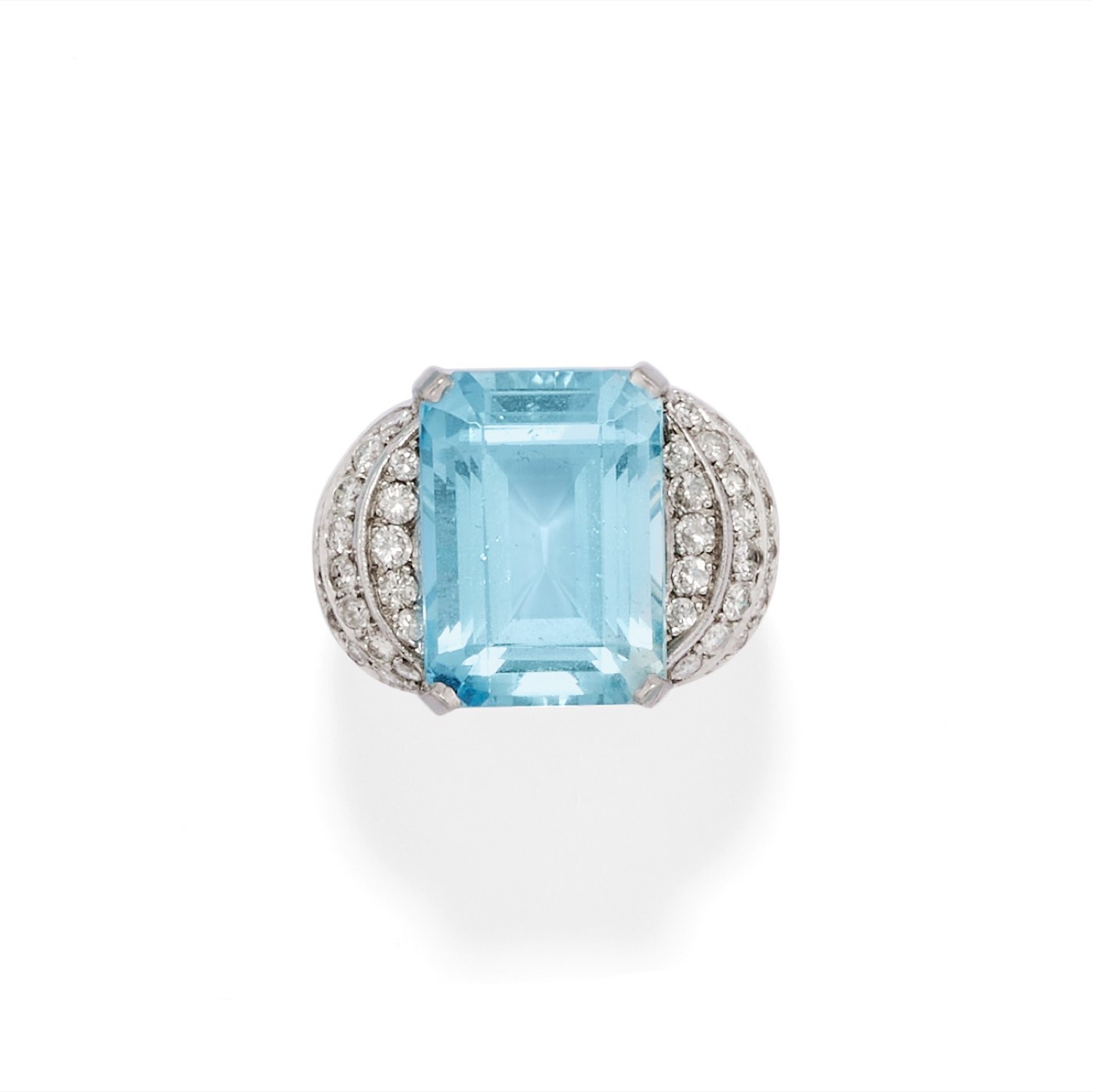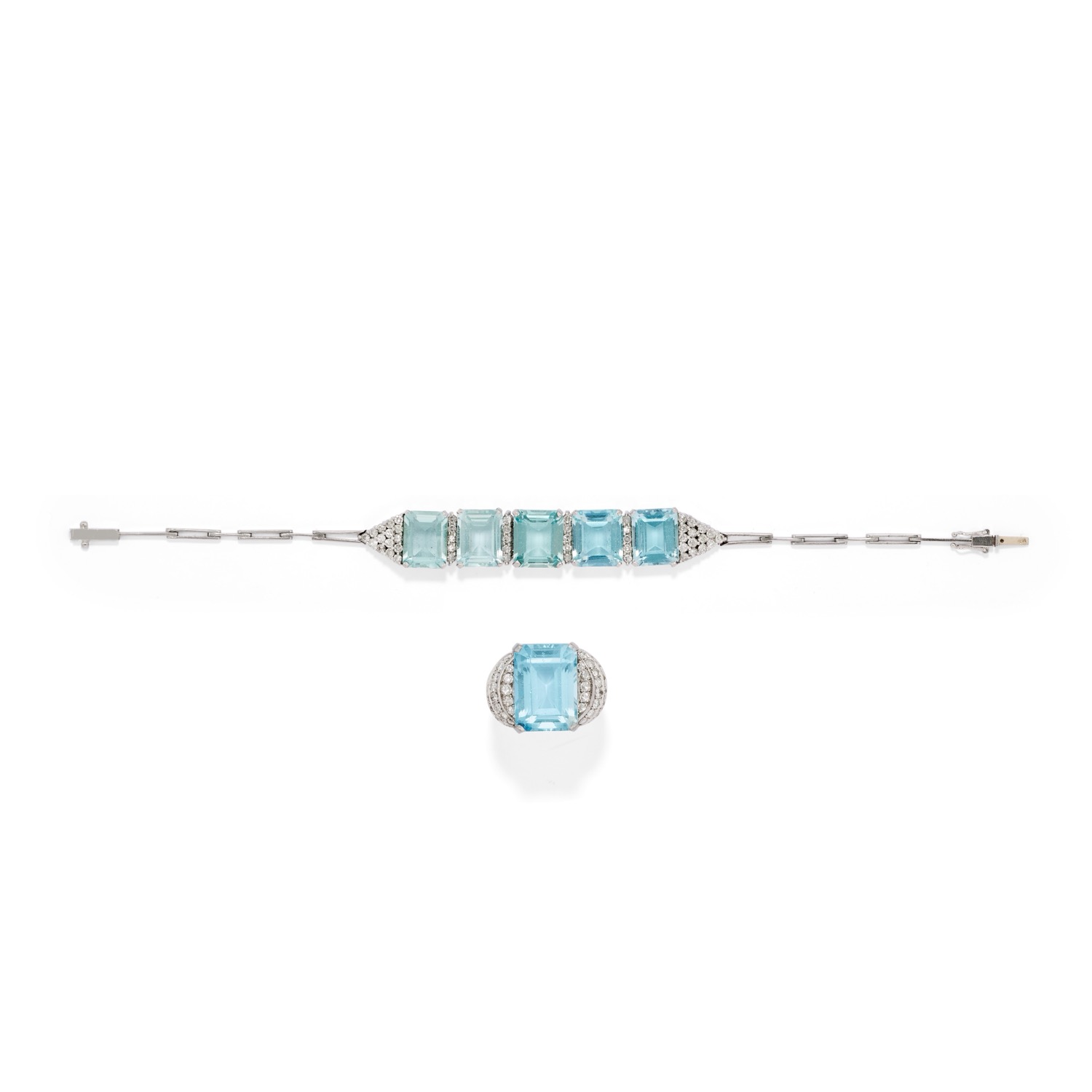 composta da bracciale e anello, con acquemarine di forma rettangolare taglio a gradini mm 12,70x17,60 circa (anello) e 10,00x12,00 circa (bracciale), impreziositi da diamanti taglio brillante.