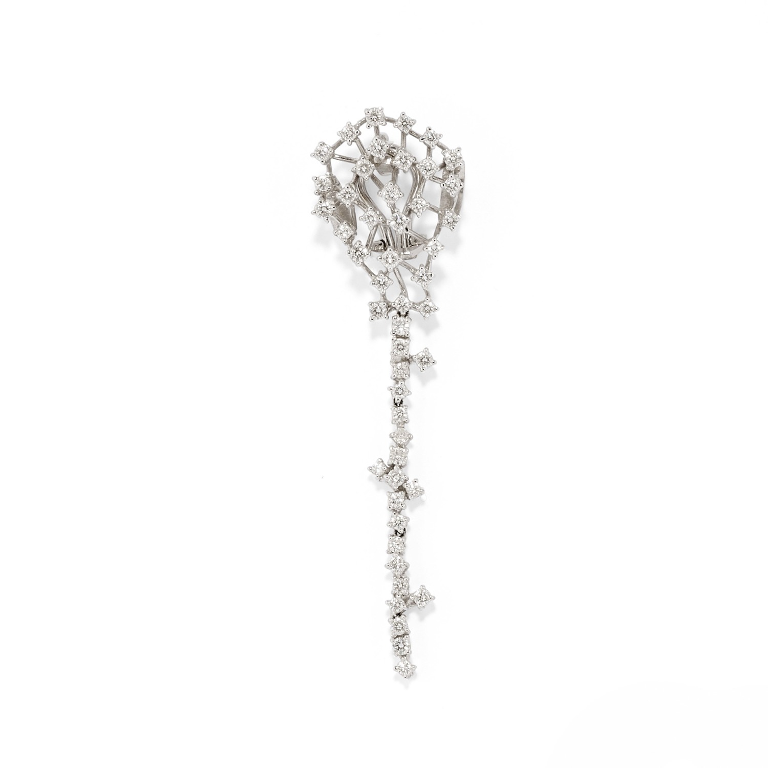a griffe snodati, decorato da diamanti taglio brillante per totale ct 1,30 circa, al retro anelli passanti e clip, accompagnato da nastrino in velluto nero di cm 45,00 con chiusura a moschettone in oro bianco 18k.