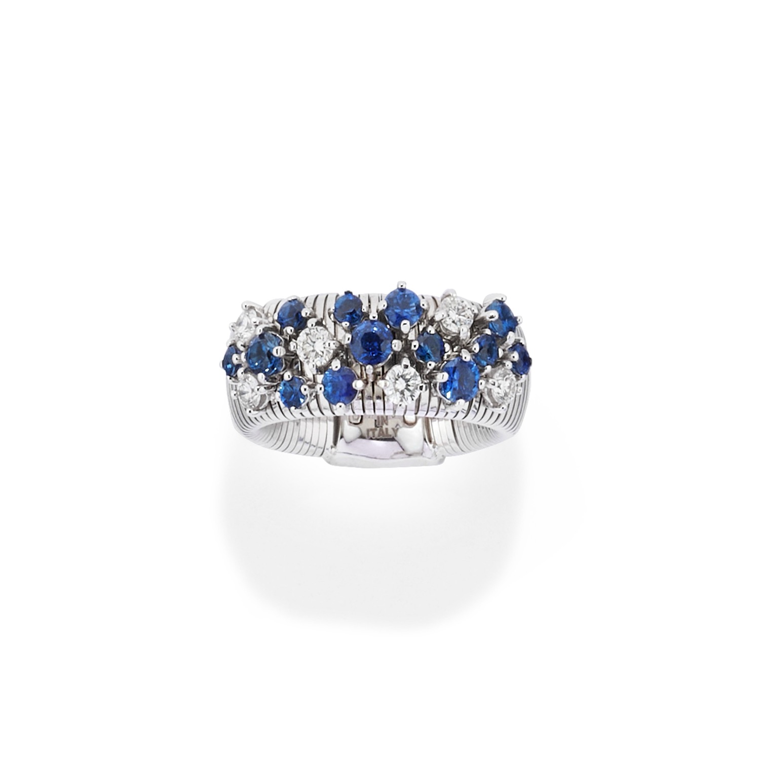 a fascia, maglia leggermente elastica, al centro motivo in diamanti e zaffiri taglio brillante.
