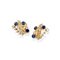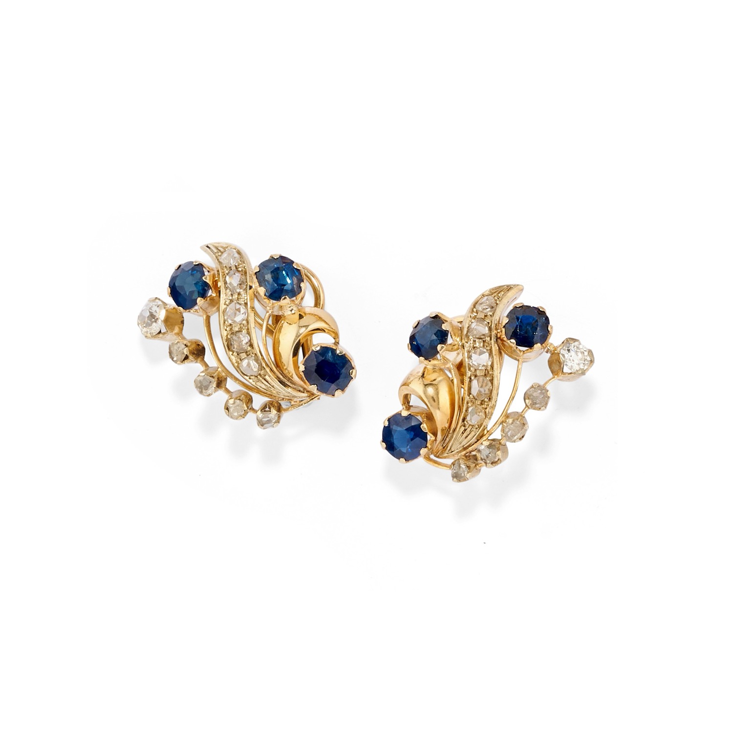 disegno fogliaceo, con zaffiri taglio cuscino per totale ct 6,00 circa e diamanti taglio vecchio e rosa a decoro, chiusura perno e clip.