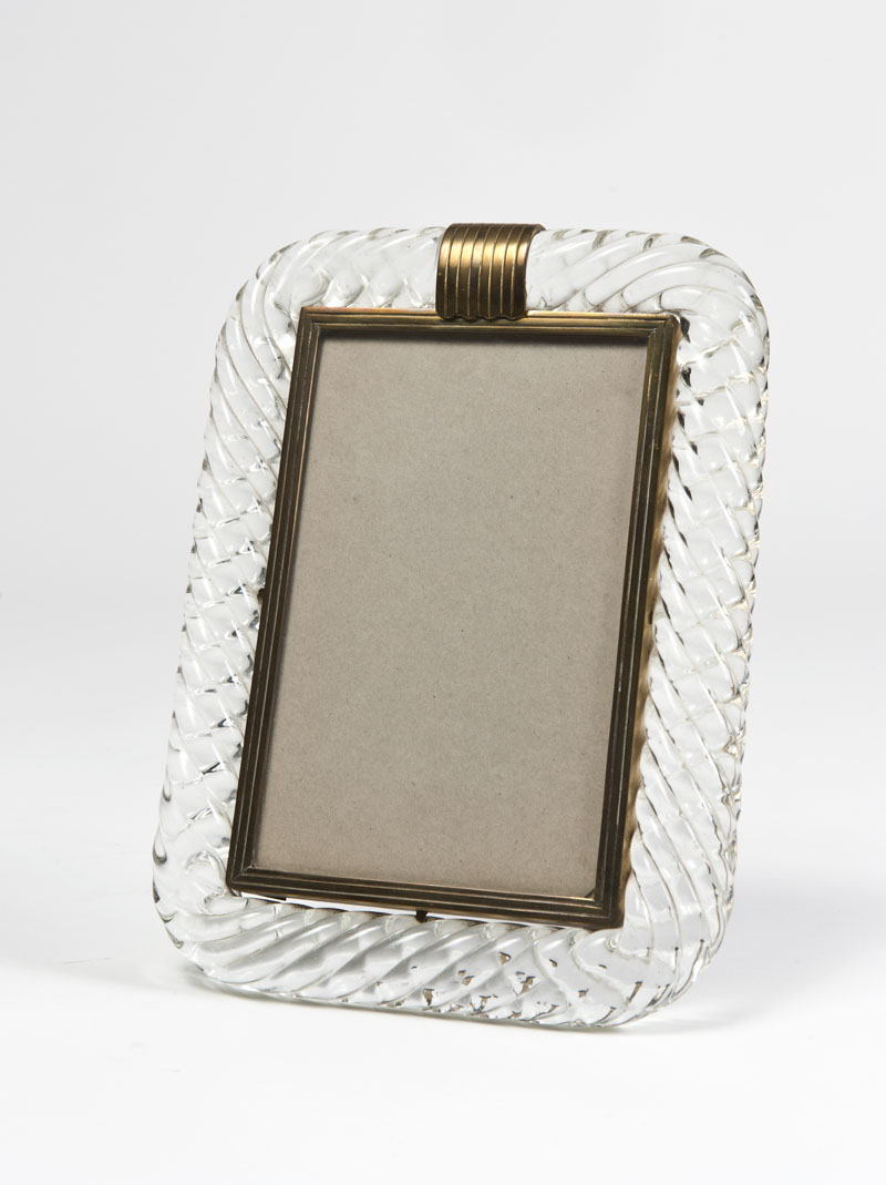 Venini. Cornice portafoto in vetro trasparente lavorato a treccia. Murano, anni '30 del secolo XX. Firma incussa sull'ottone. Reca etichetta dell'epoca