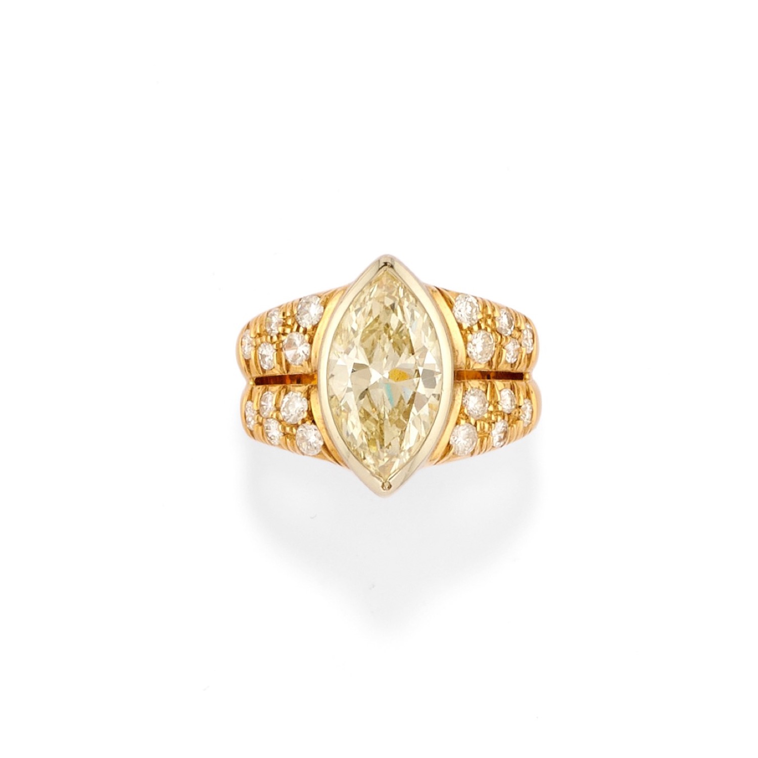 al centro diamante giallo taglio marquise di ct 3,30 circa e diamanti taglio brillante a decoro sui lati.