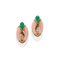 di forma a navette, con corallo rosa costolato, sormontato da crisoprasio taglio goccia cabochon e motivo in diamanti taglio brillante per totale ct 0,20 circa, chiusura a clip.