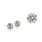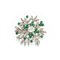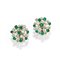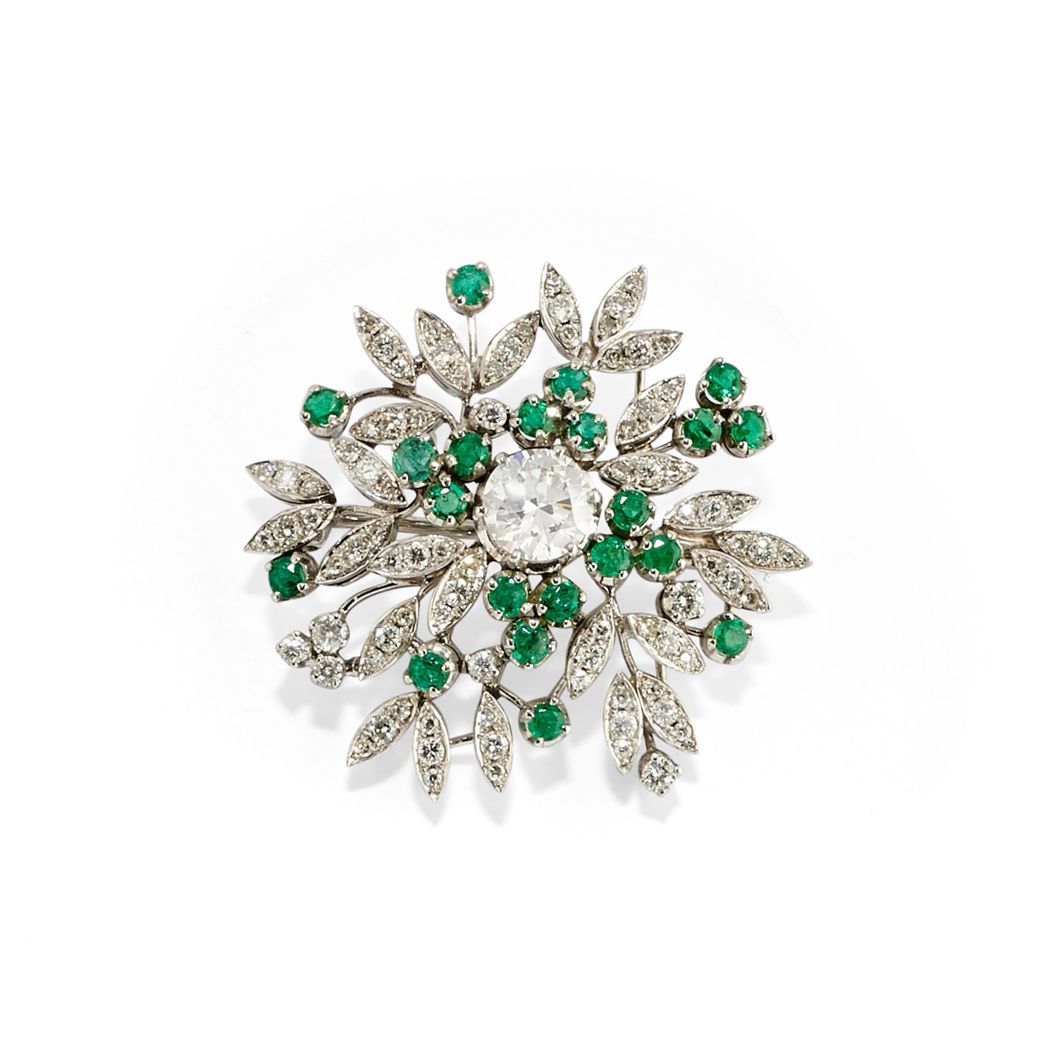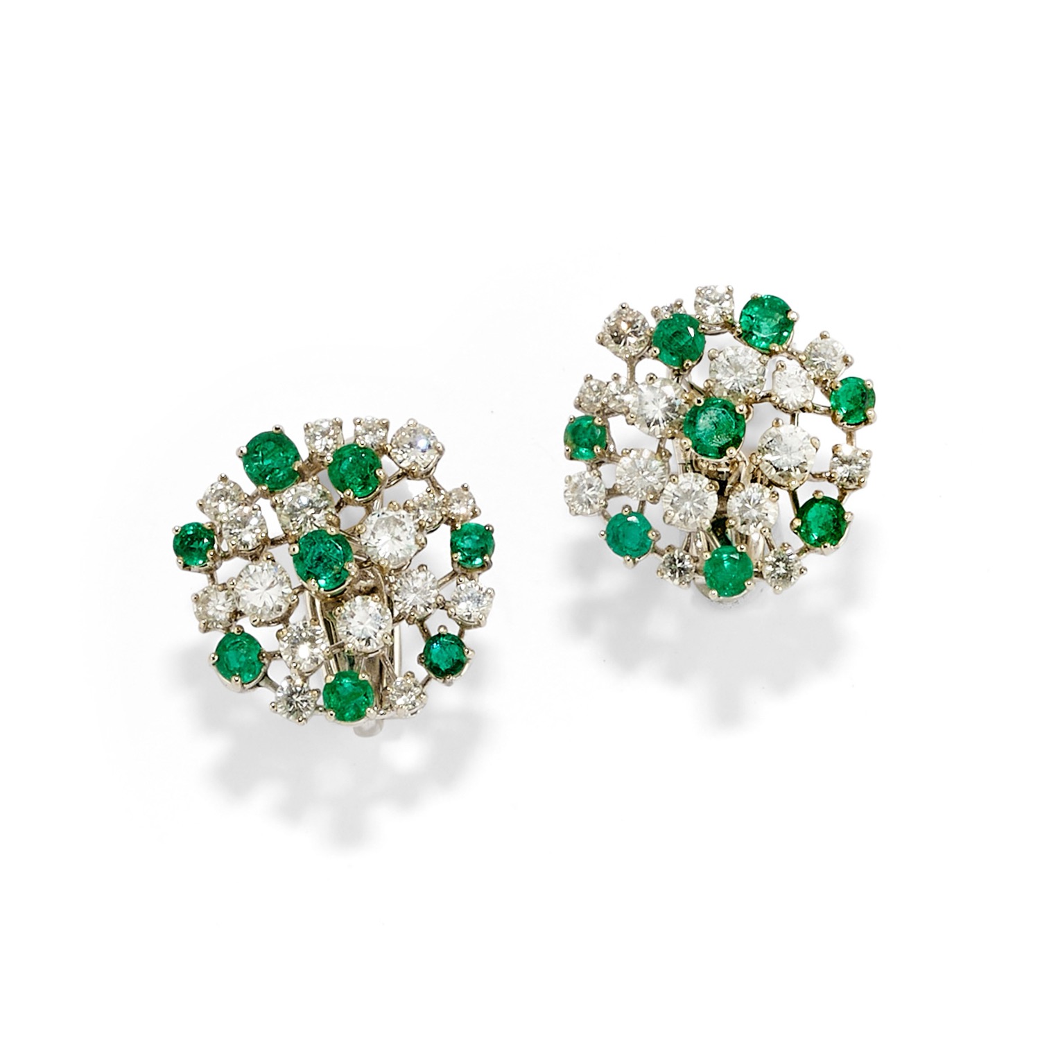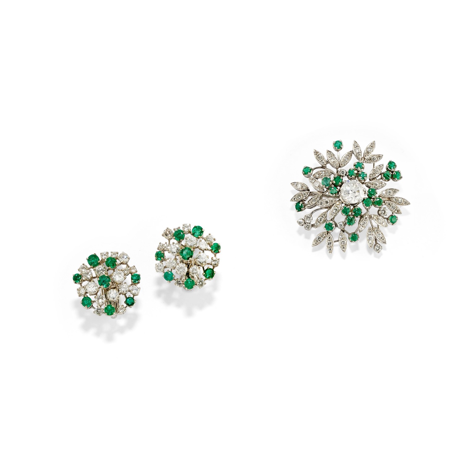 composta da spilla di forma circolare con foglie in diamanti taglio brillante e huit-huit, smeraldi taglio rotondo con al centro diamante taglio brillante di ct 1,30 circa (prob. colore H, purezza VVS/VS), e coppia di orecchini a bottone con diamanti taglio brillante per totale ct 3,50 circa e smeraldi taglio rotondo per totale ct 1,00 circa, chiusura a clip.