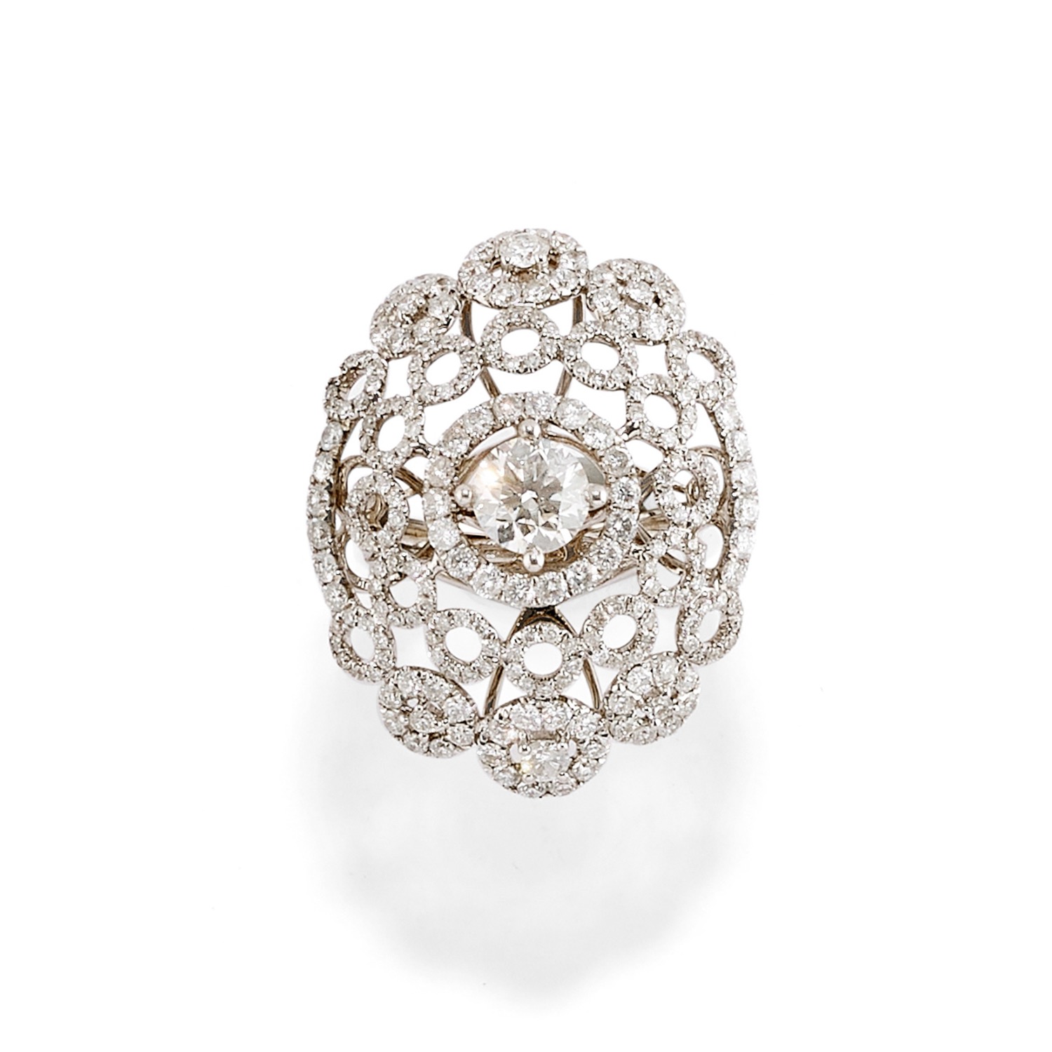 a motivo traforato, con al centro diamanti taglio brillante di ct 0,90 circa (prob colore J purezza VS1) ed interamente decorato da diamanti taglio brillante per totale ct 4,00 circa (prob colore H/I purezza SI2/SI1).