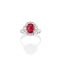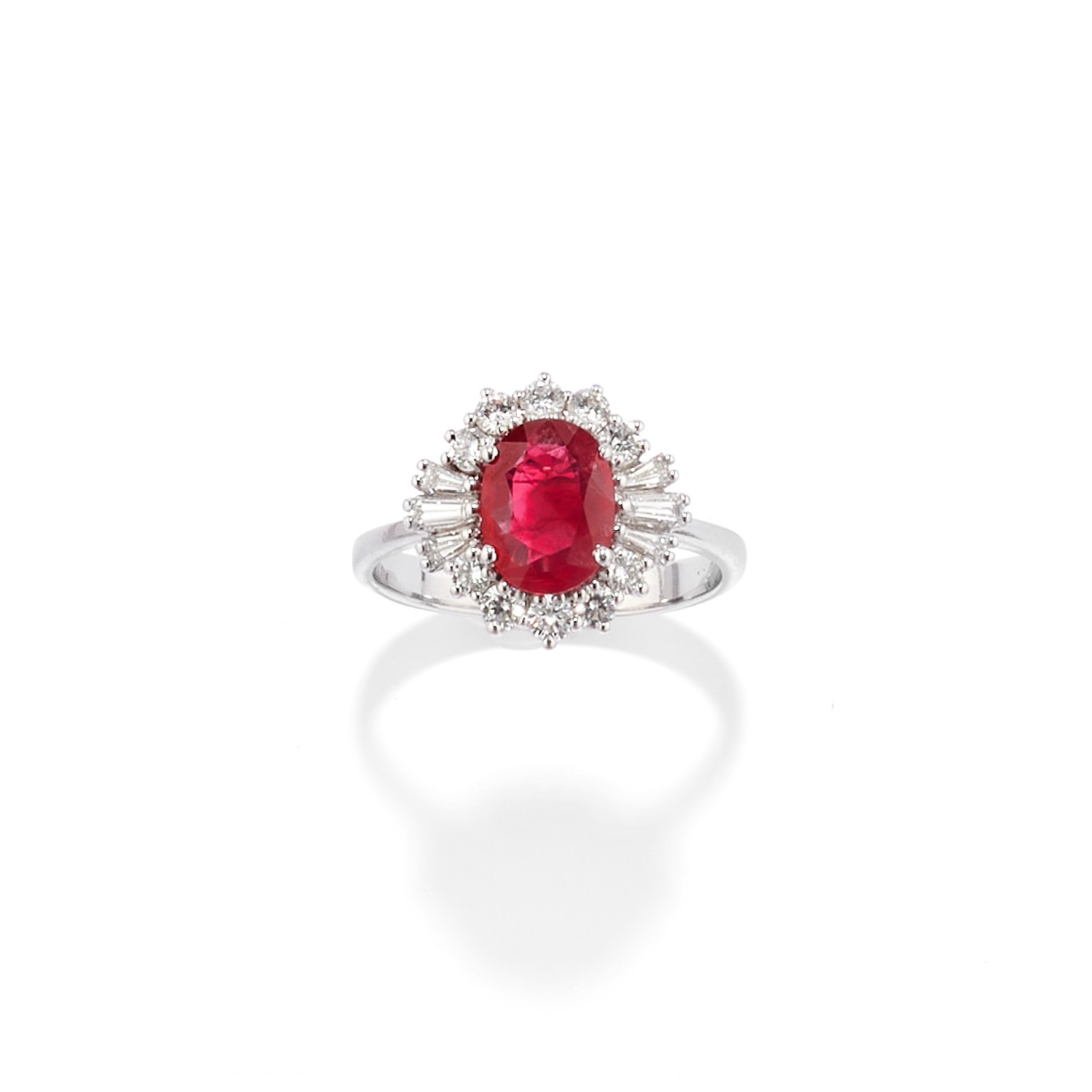 al centro rubino taglio ovale di ct 1,84 (caratura incisa) entro contorno di diamanti taglio brillante e tapered-baguette per totale ct 0,80 (caratura incisa).
