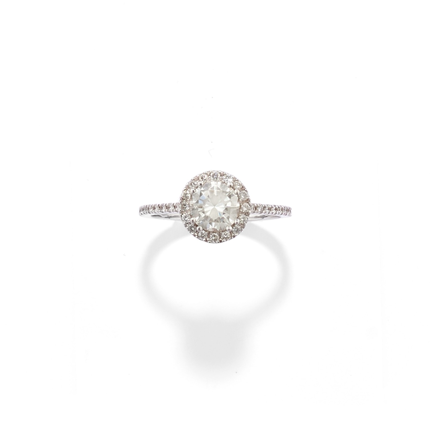 al centro diamante taglio brillante di ct 1,00 circa (prob. colore J purezza VVS/VS) e diamanti taglio brillante a decoro.