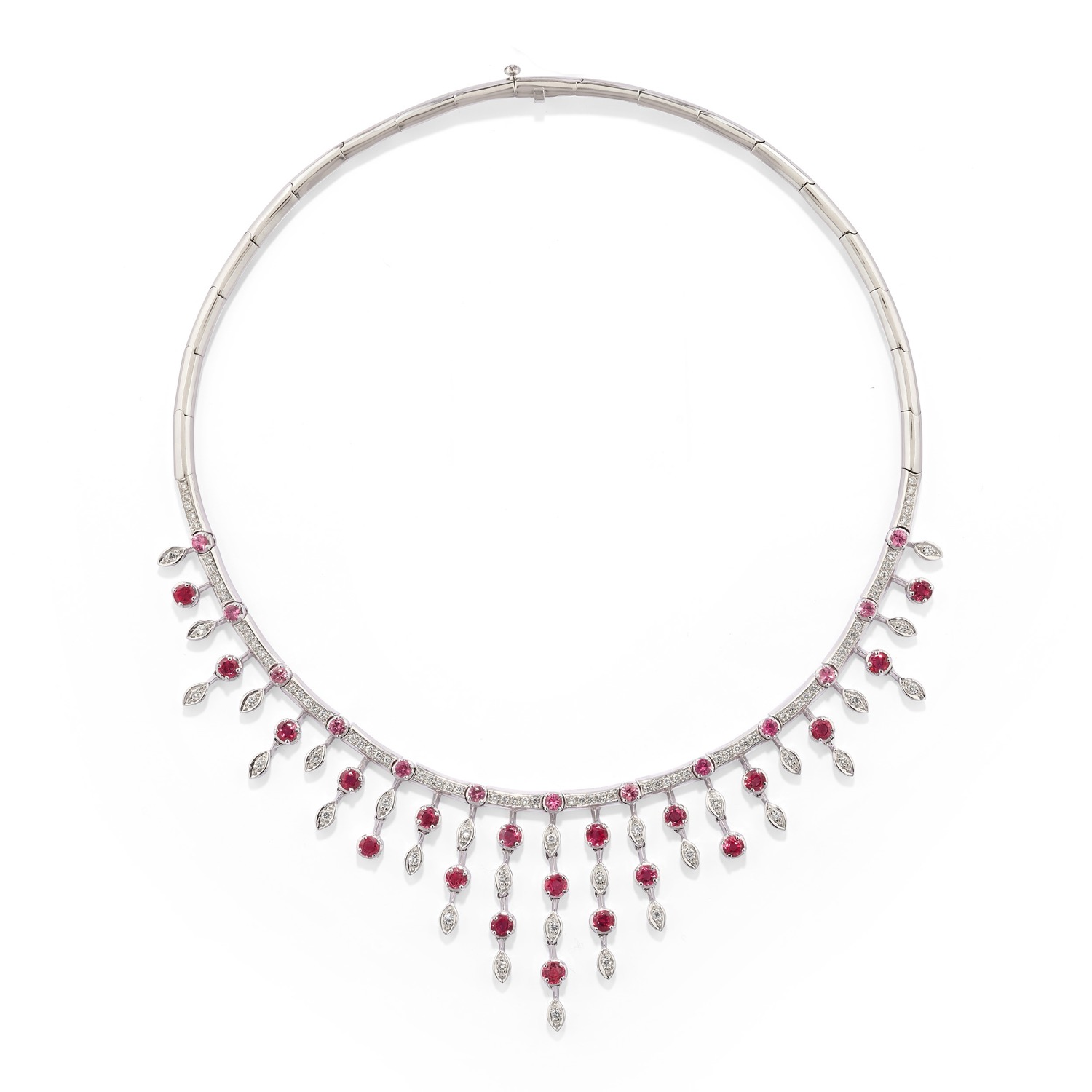 a girocollo, con motivo frangiato centrale, con zaffiri rosa taglio rotondo e diamanti taglio brillante.