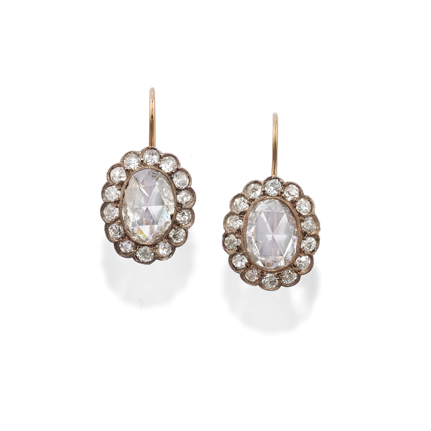 al centro diamanti di forma ovale taglio briolette per totale ct 3,00 circa entro contorno di diamanti taglio vecchio, con chiusura a monachella.