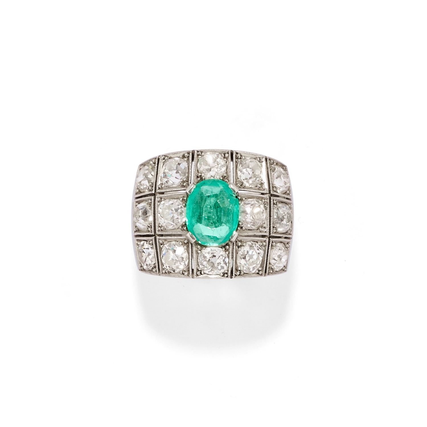 a fascione, con al centro smeraldo taglio ovale di ct 2,00 circa entro motivo a scacchiera con diamanti taglio vecchio per totale ct 2,50 circa e decoro al milligrano.
