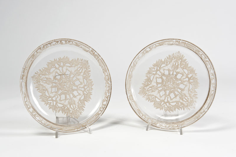 René Lalique (1860 - 1945) - Coppia di piatti modello “Chasse Chiens” in vetro trasparente soffiato in stampo, molato e colorito, decorato in negativo con figure geometrizzate di cani, uccelli e arbusti. Disegno del 1914, realizzazione ante 1947. Firmati a punta in grafia corsiva “R. Lalique”. (d cm 21) Bibliografia: F. Marcilhac, R. Lalique. Catalogue raisonné de l’oeuvre de verre, Les éditions de l’amateur, Paris 2004, p. 699