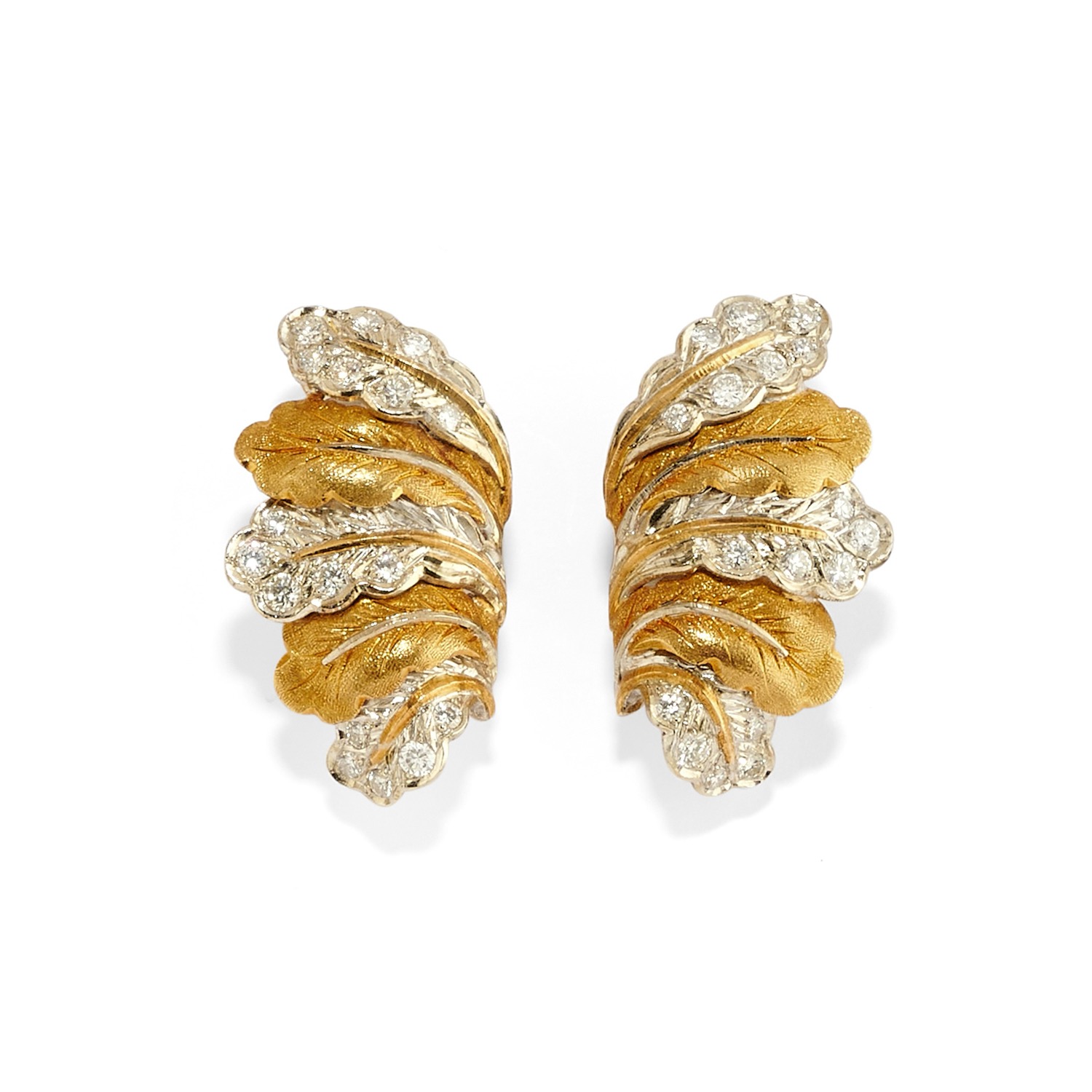 motivo a foglie incise e a rilievo decorate da diamanti taglio brillante per totale ct 1,50 circa, chiusura a clip.