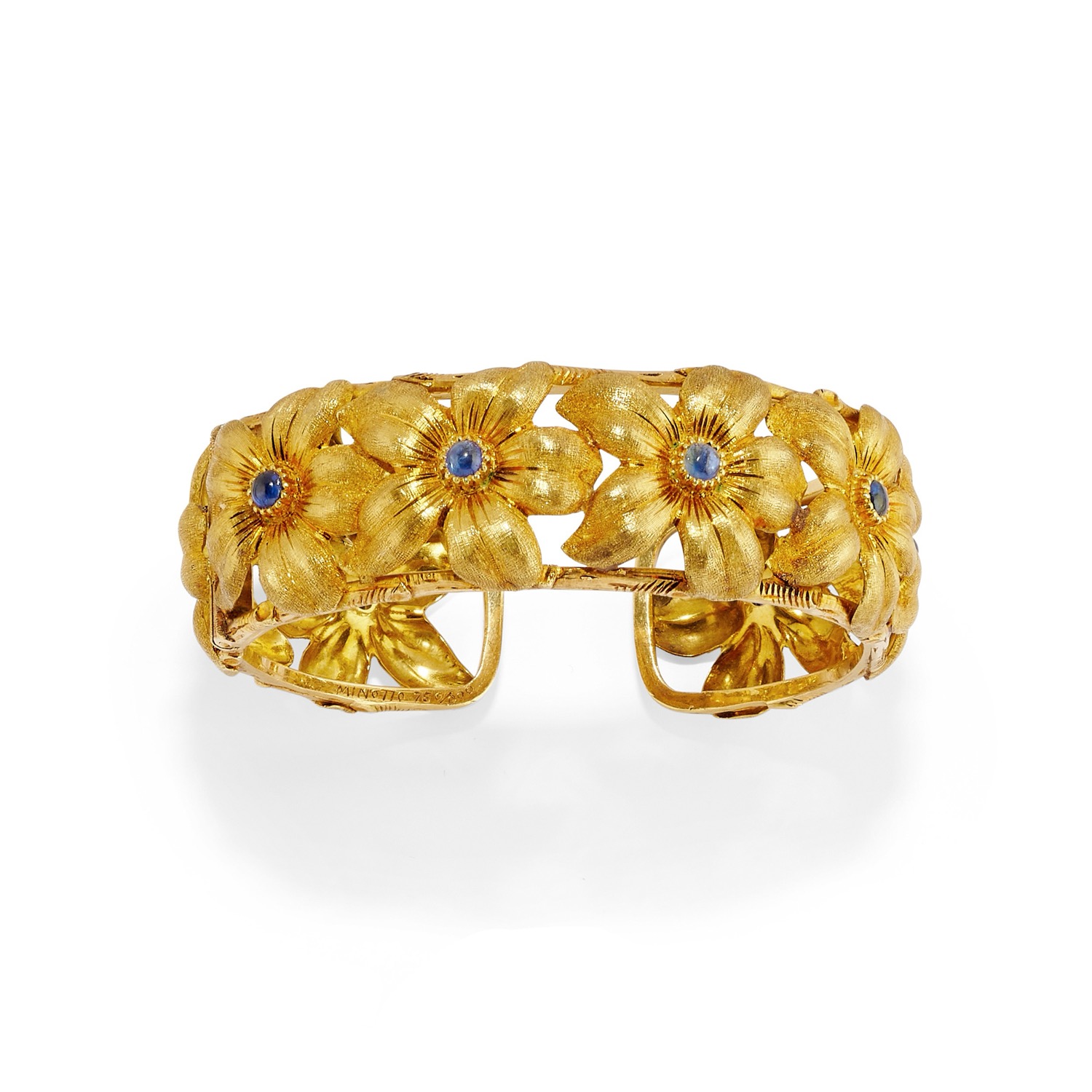 rigido, realizzato con petali incisi, decorati al centro da zaffiri taglio rotondo cabochon, apertura a scatto, reca firma Minotto.