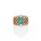 a fascia, montatura traforata, al centro smeraldo taglio rettangolare a contorno ottagonale di ct 1,80 circa e due diamanti taglio brillante per totale ct 0,40 circa.