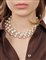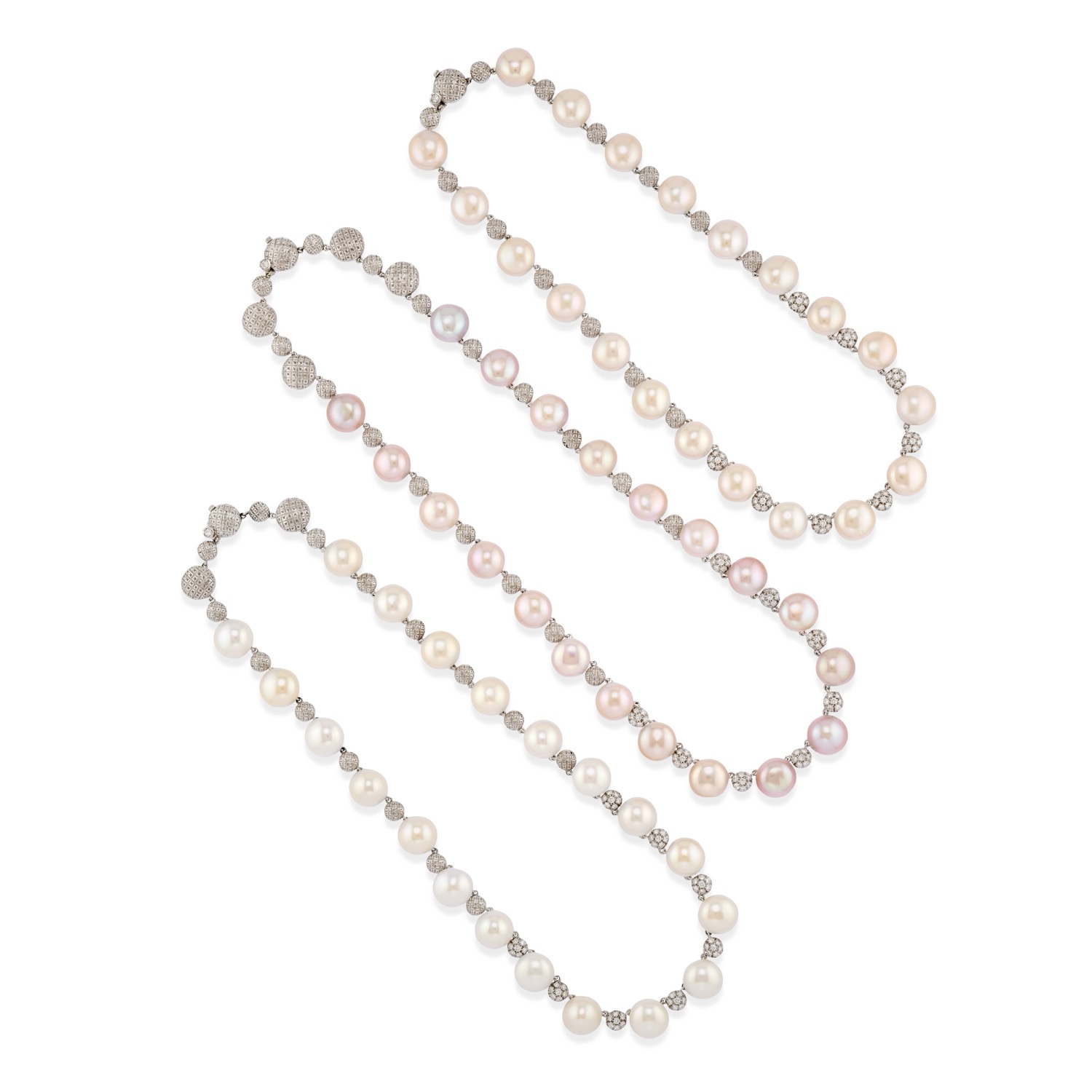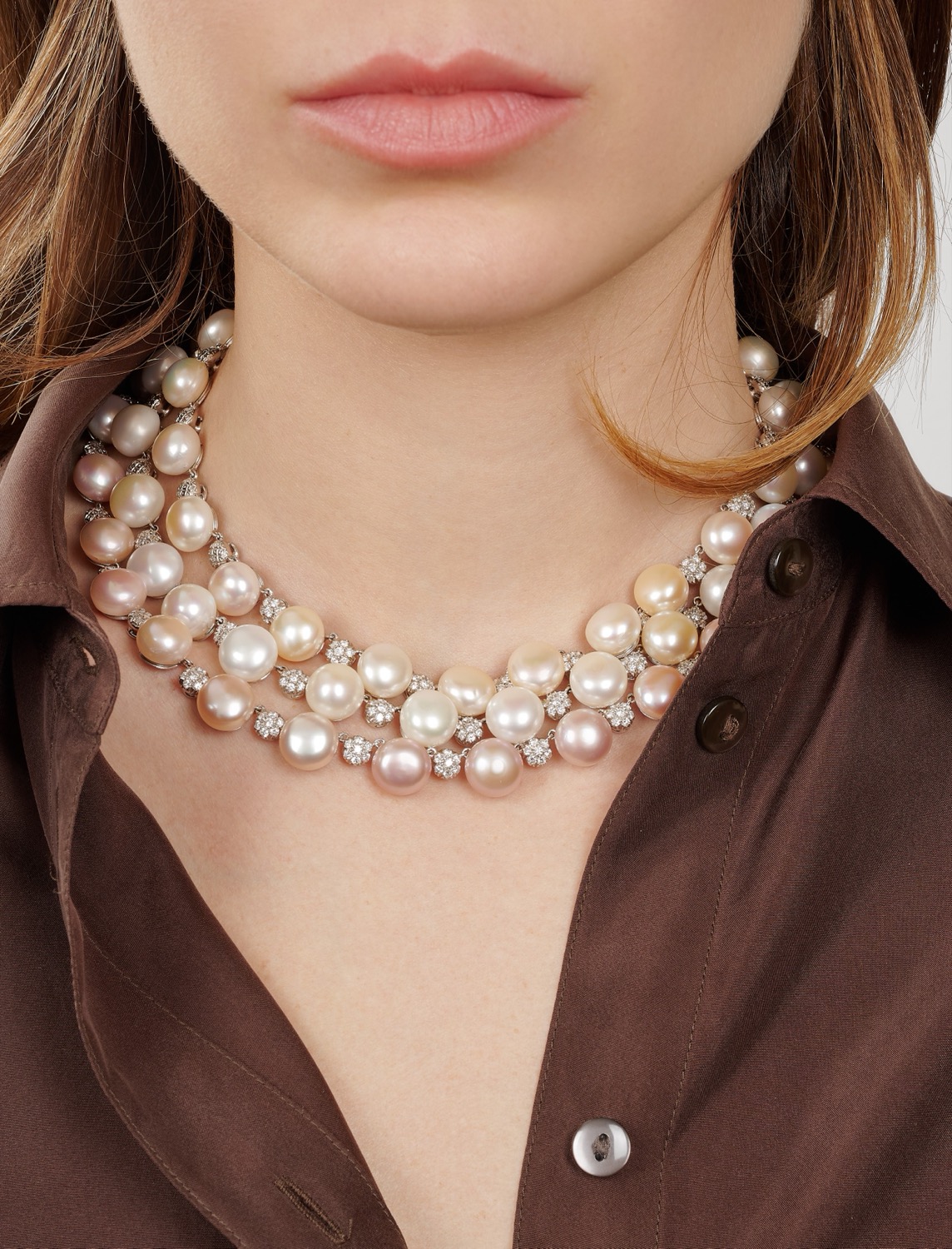 composta da tre collane con perle a bottone di mm 10,50/11,50 circa, a sfumare nei toni del bianco, bianco-crema, bianco-rosa e lilla, alternate da motivi a fiore in diamanti taglio brillante, utilizzabili singolarmente o unite a formare un'unica collana a girocollo, con scatola.