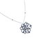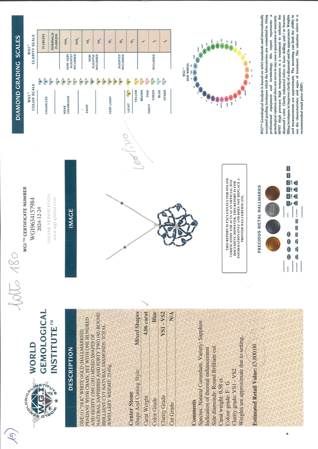 realizzata con pendente a fiore traforato decorato da zaffiri taglio goccia e rotondo per totale ct 4,06 circa e diamanti taglio brillante per totale ct 0,58 circa (prob colore F/G purezza VS1/VS2), trattenuto da catena roleaux.