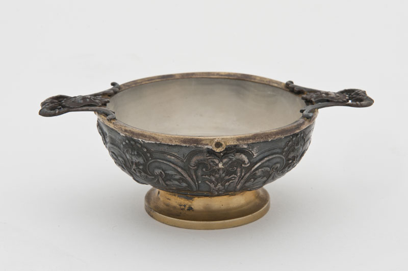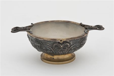 Alberto Issel (Genova 1848 - 1926) - Coppetta biansata in argento sbalzato a mascheroni e volute fogliate, interno in pietra dura. Reca etichetta cartacea alla base (d cm 10)