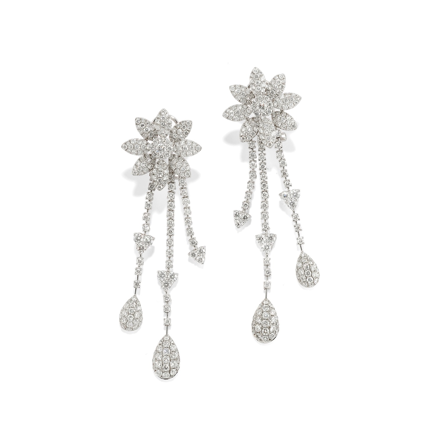motivo a margherita, che trattiene tre pendenti interamente decorati da diamanti taglio brillante per totale ct 5,60 circa (prob colore F/G purezza VS2/SI1), chiusura perno e clip.