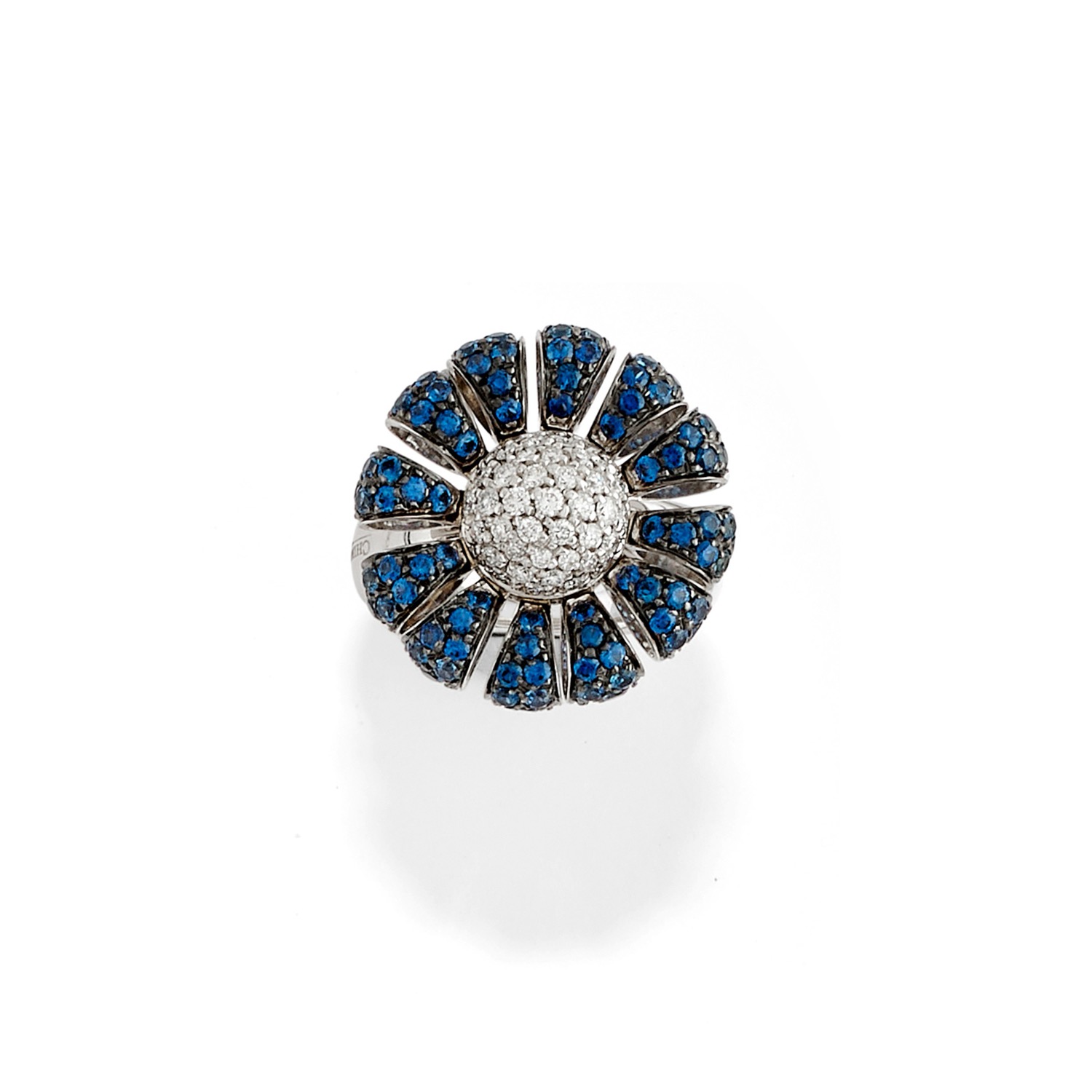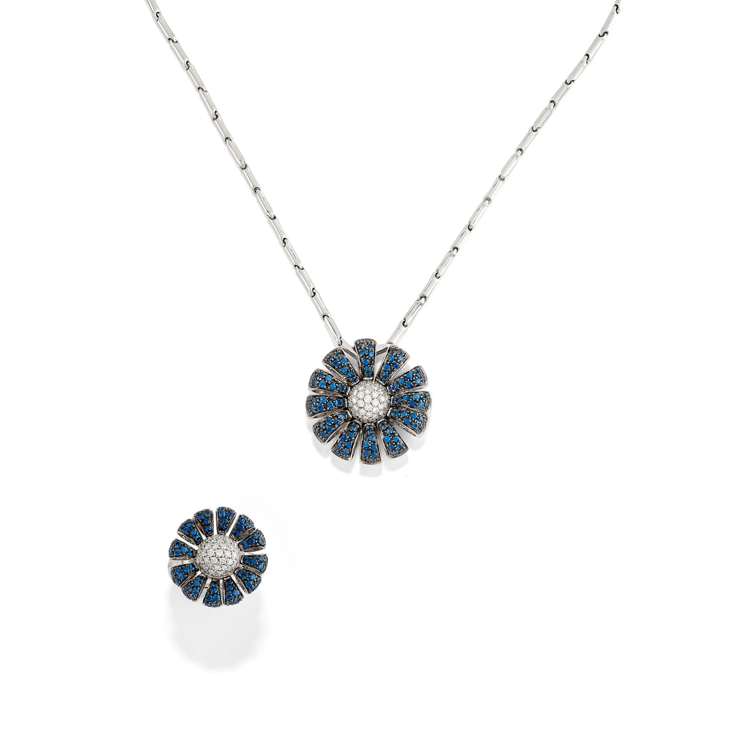 composta da collana ed anello a margherita con petali mobili in zaffiri taglio rotondo e al centro diamanti taglio brillante.