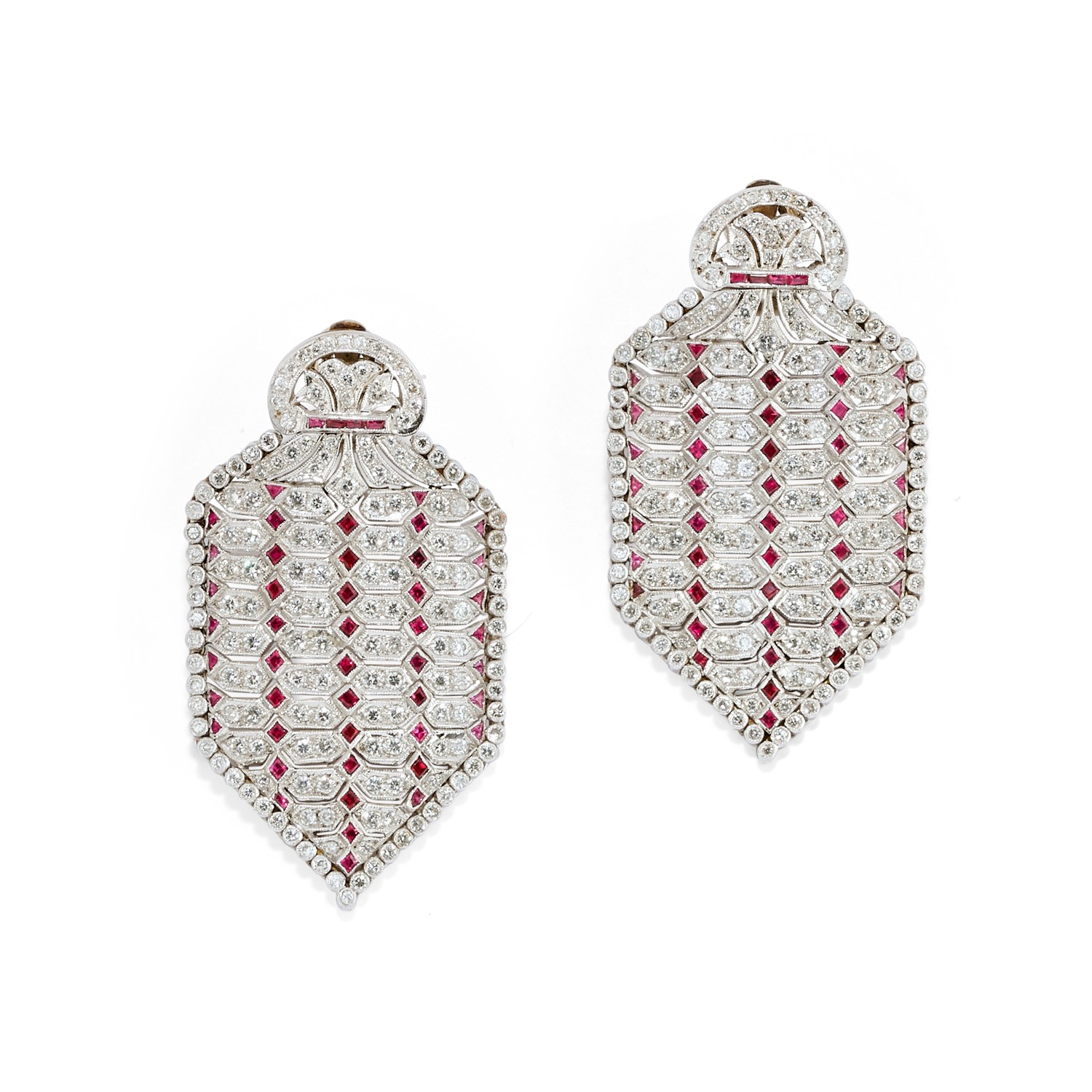 con maglia snodata, interamente decorati da diamanti taglio brillante e rubini taglio carrè, decoro a milligrano, chiusura a clip.