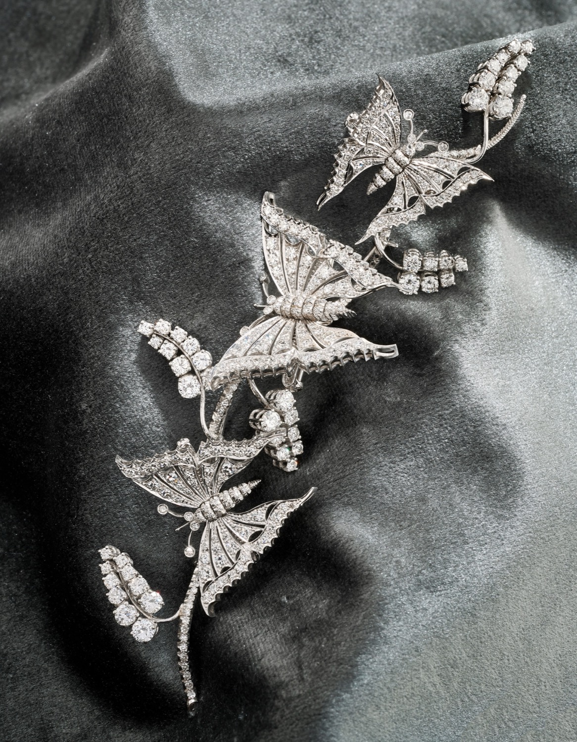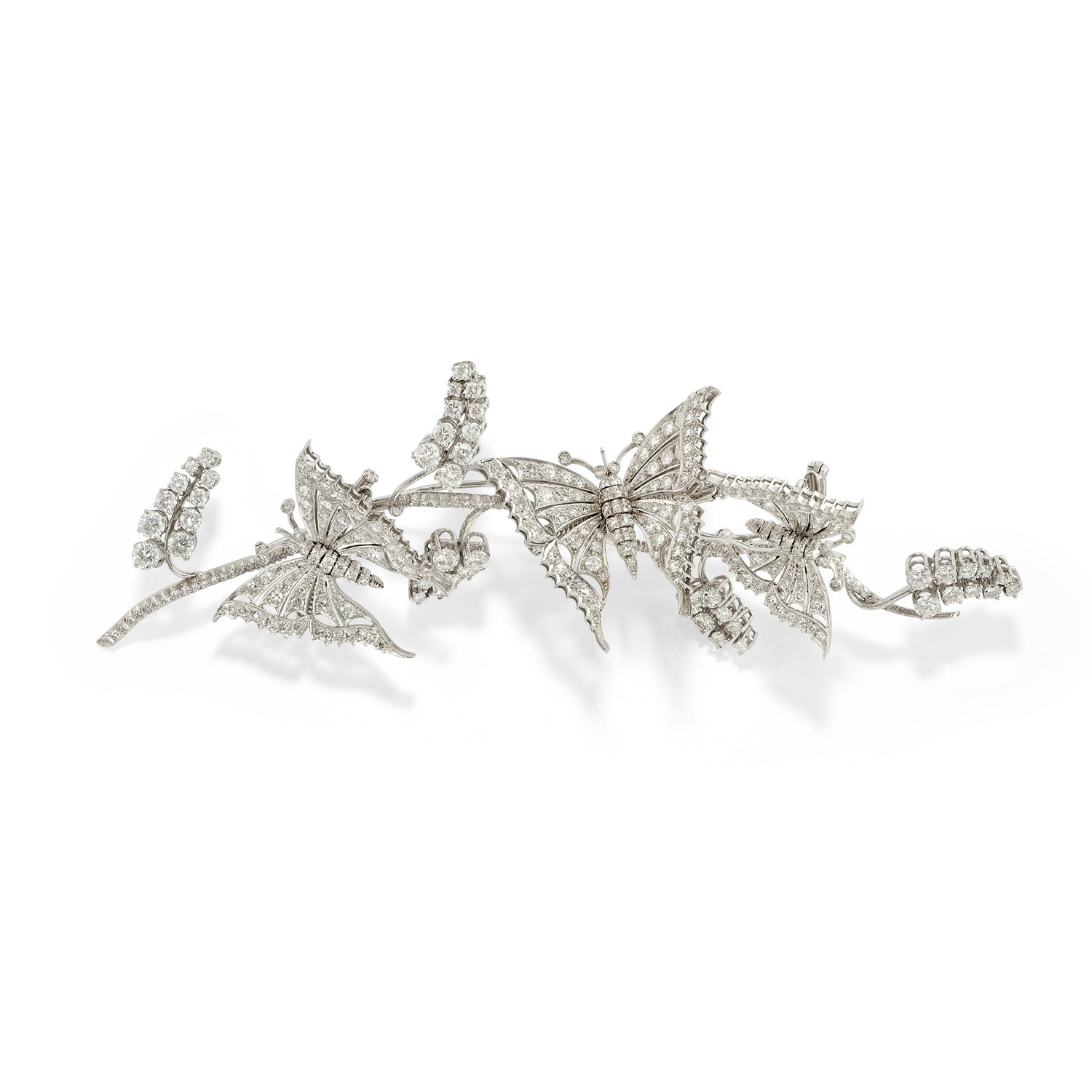 a tralcio di vite con frutti, sul quale si poggiano tre spille amovibili a foggia di farfalla con ali mobili, utilizzabili anche singolarmente, interamente decorata da diamanti taglio brillante e huit-huit per totale ct 15,00/20,00 circa, con astuccio Knight, Napoli.