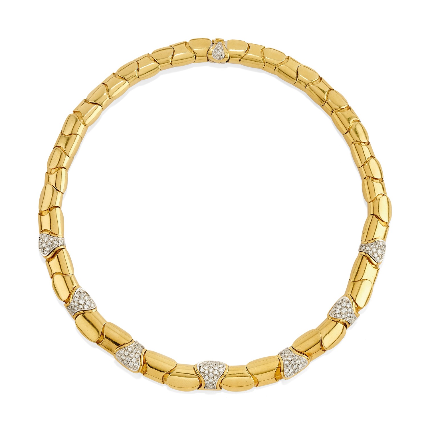 a girocollo, realizzata con maglie snodate e bombate, con inserti in diamanti taglio brillante a pavè per totale ct 1,00 circa.
