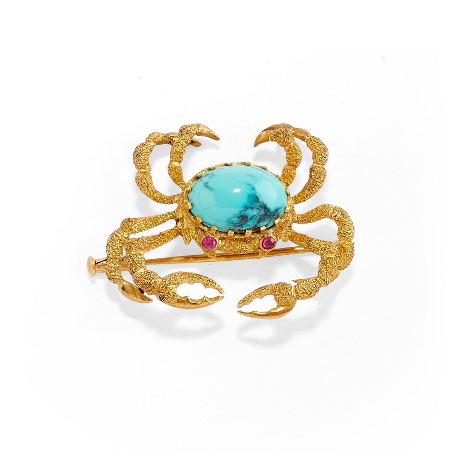 con turchese taglio ovale cabochon e rubini agli occhi.