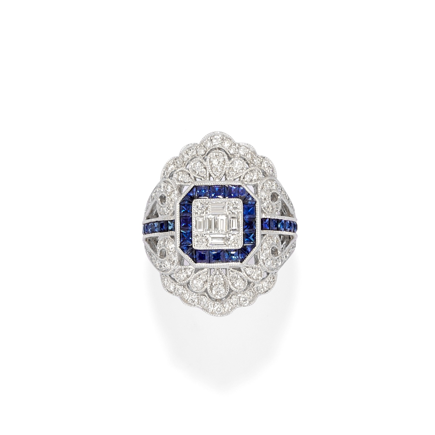 a fascia traforata, decoro al milligrano con disegno in zaffiri taglio carrè per totale ct 1,69 (caratura incisa) e diamanti taglio brillante e baguette per totale ct 1,17 (caratura incisa).