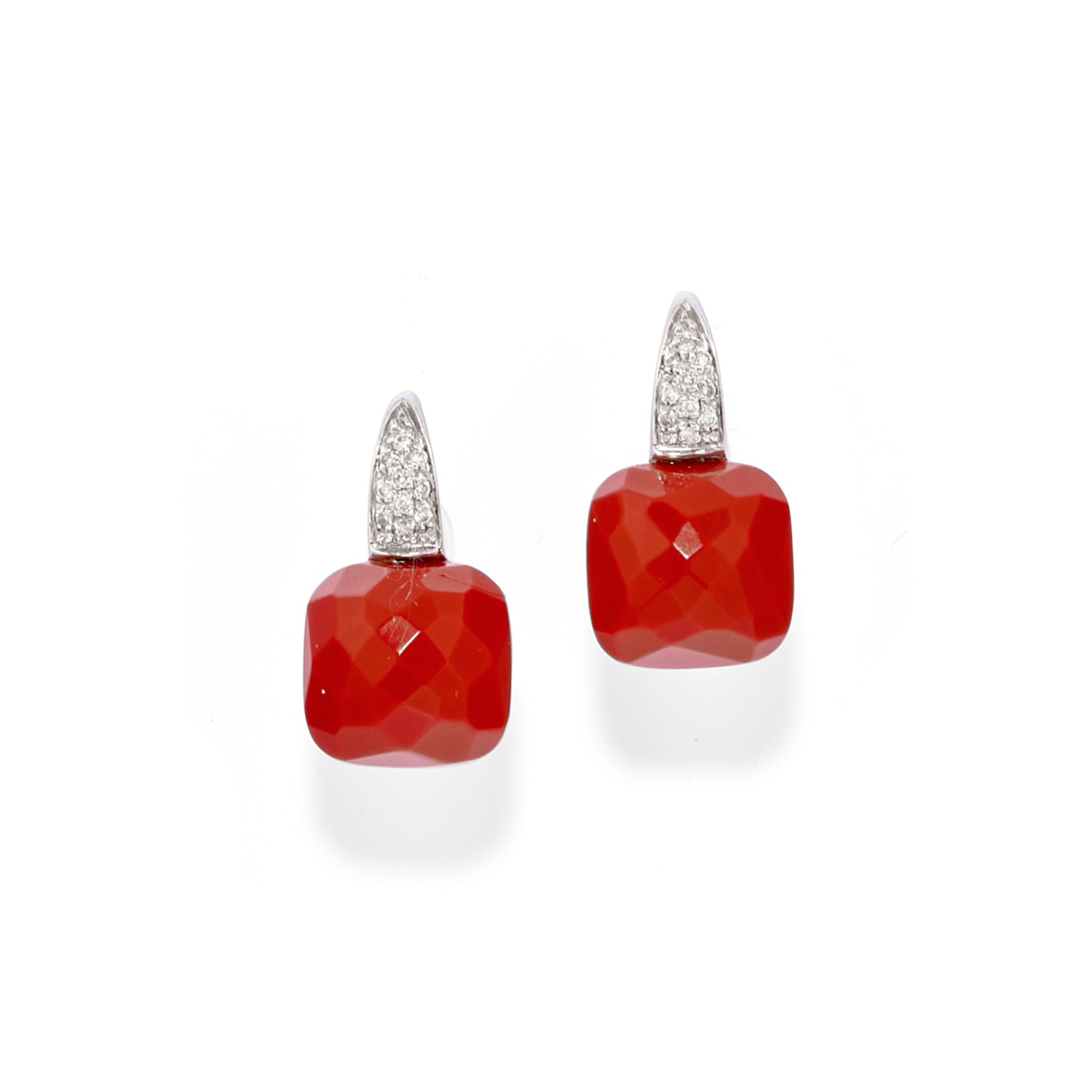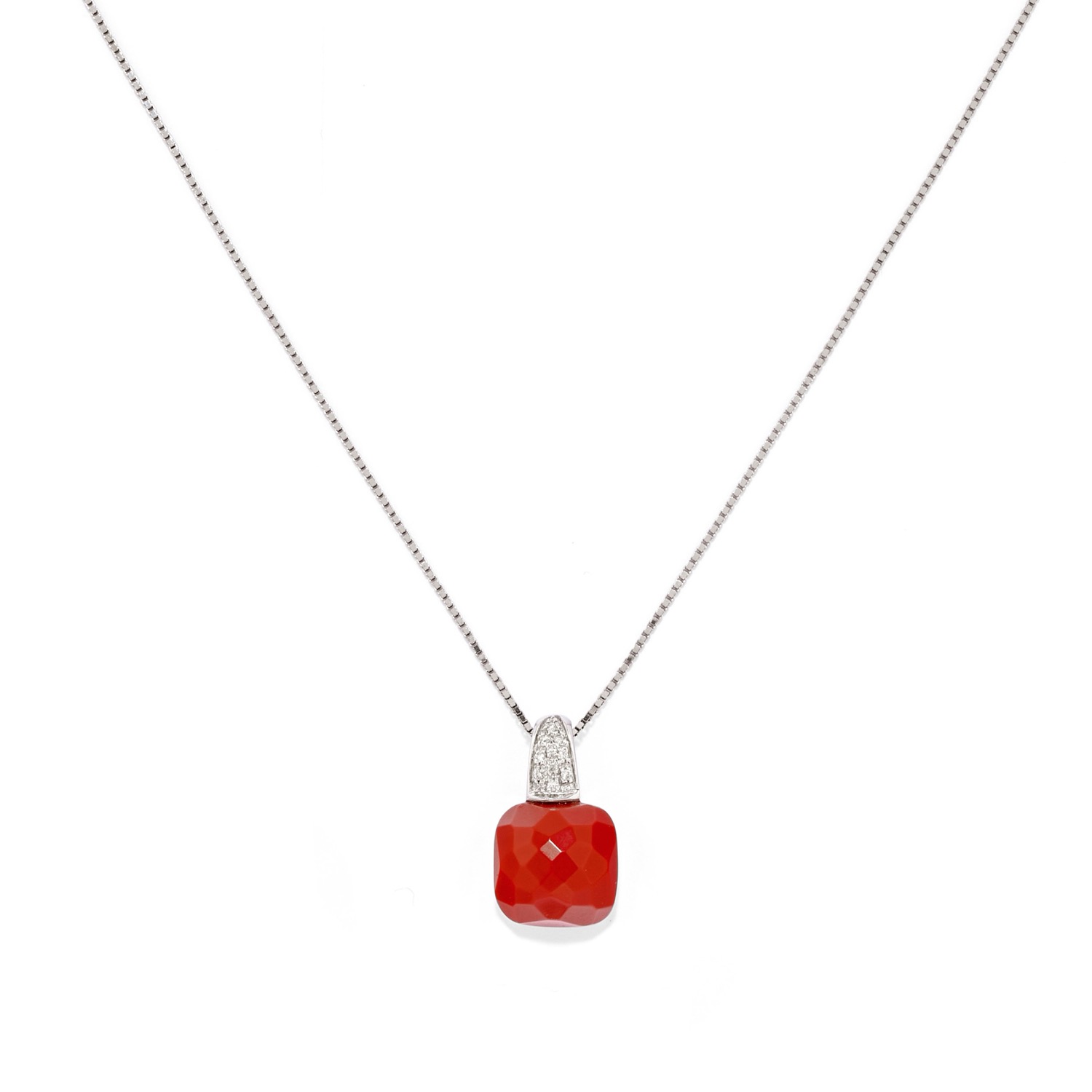 composta da collana con pendente, orecchini con chiusura a monachella e anello, con corallo di forma quadrata sfaccettato e diamanti taglio brillante per totale ct 0,50 circa.