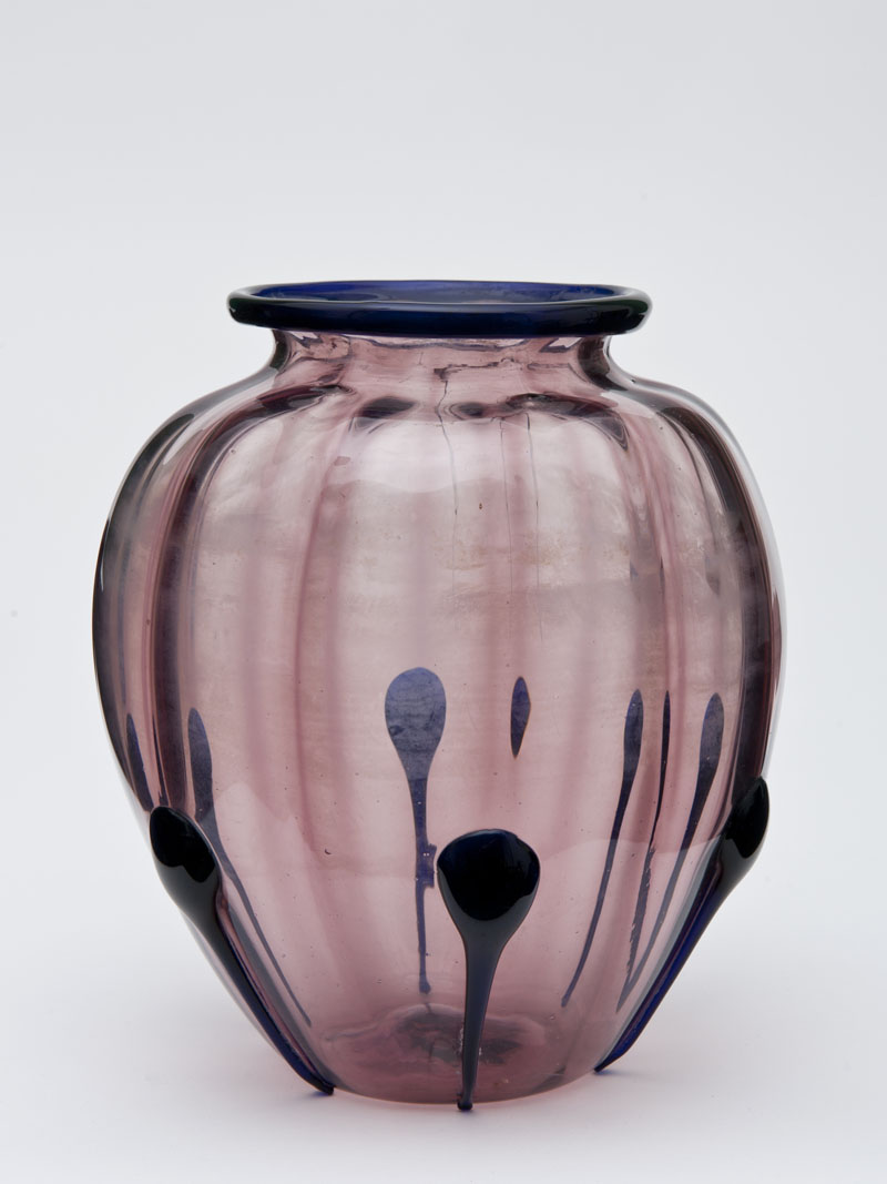 Vittorio Zecchin (1878 - 1947) - Vaso in vetro soffiato color ametista, corpo costolato con orlo e gocce laterali in vetro blu cobalto applicato a caldo. Manifattura Cappellin Venini (?), Murano 1921-1925. (h cm 23) (gravi difetti) Bibliografia: M. Barovier, M. Mondi, C. Sonego, Vittorio Zecchin 1878-1947. Pittura, vetro, arti decorative, Marsilio, Venezia 2002, pp. 198, 200-203