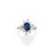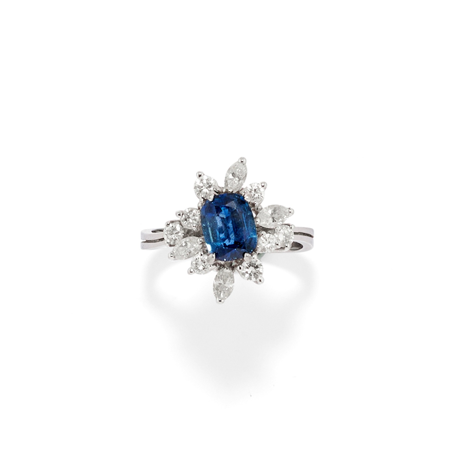 al centro zaffiro taglio ovale di ct 1,30 circa entro contorno di diamanti taglio brillante e navette per totale ct 0,50 circa.