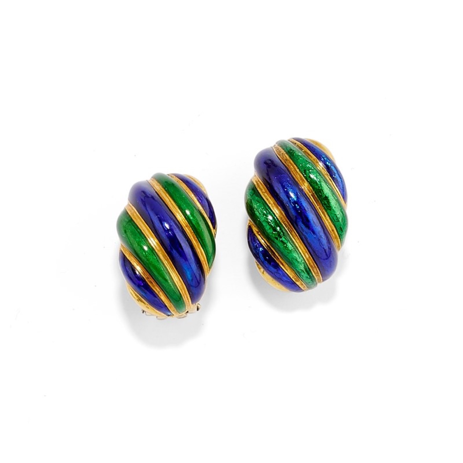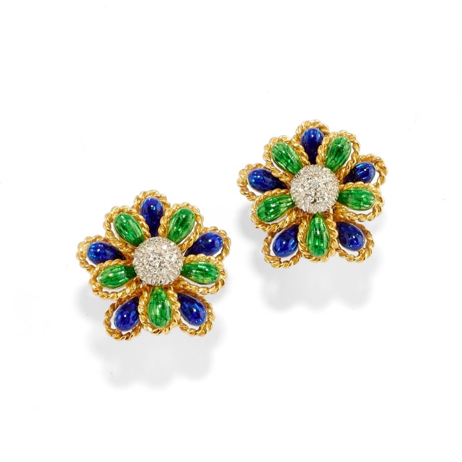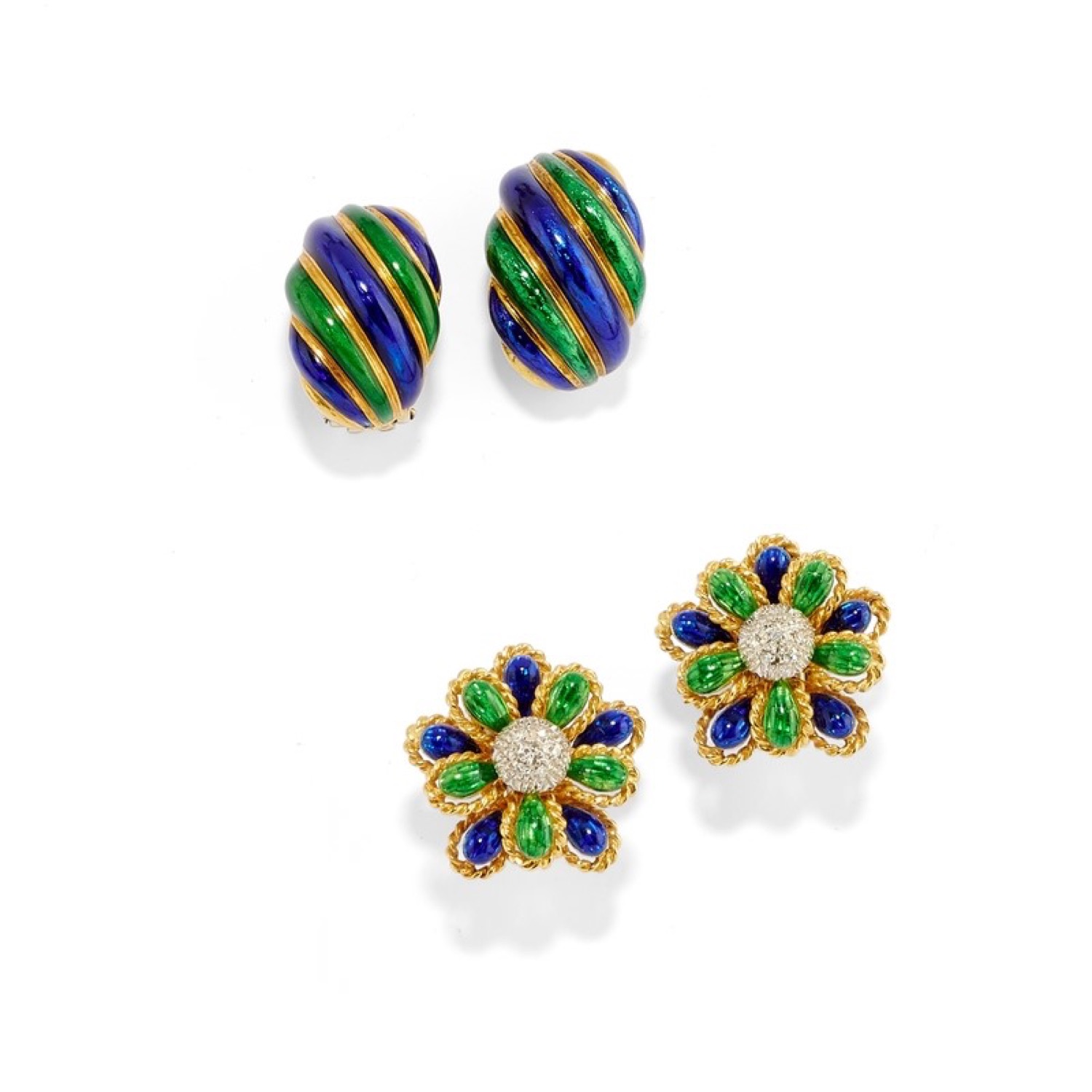 realizzati con motivo costolato e a fiore, con smalti policromi nei toni del verde e del blu, con diamanti taglio huit-huit, chiusura a clip.