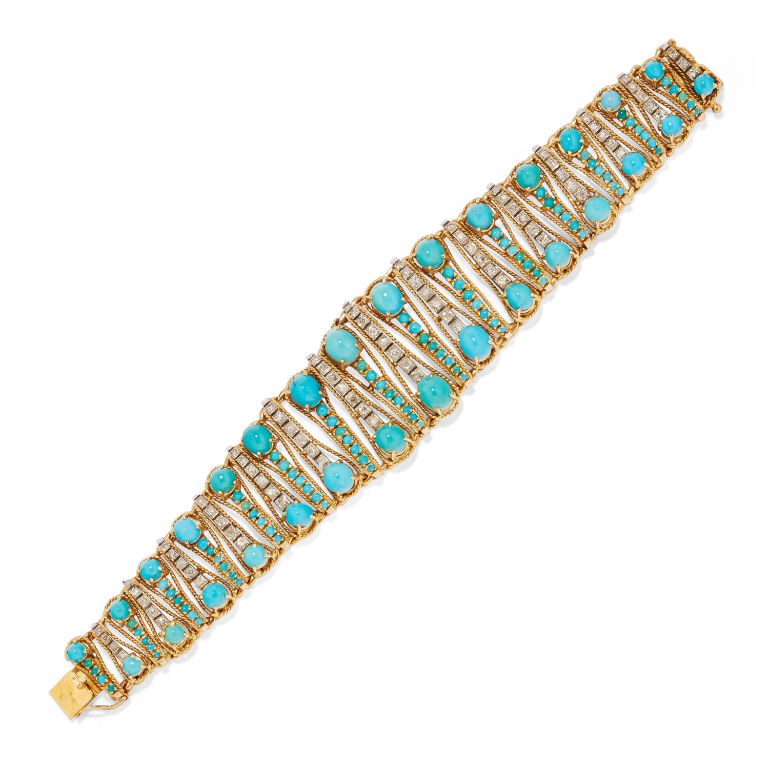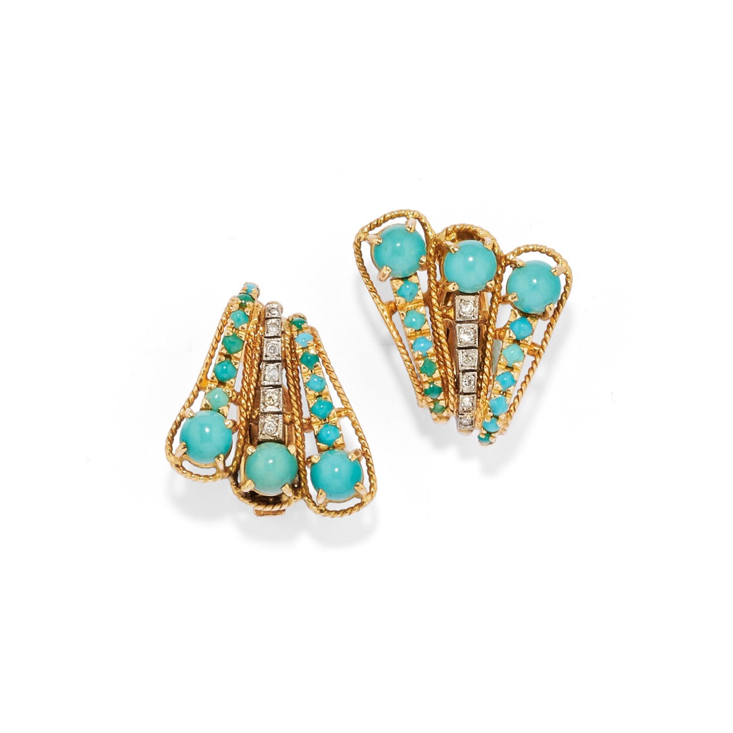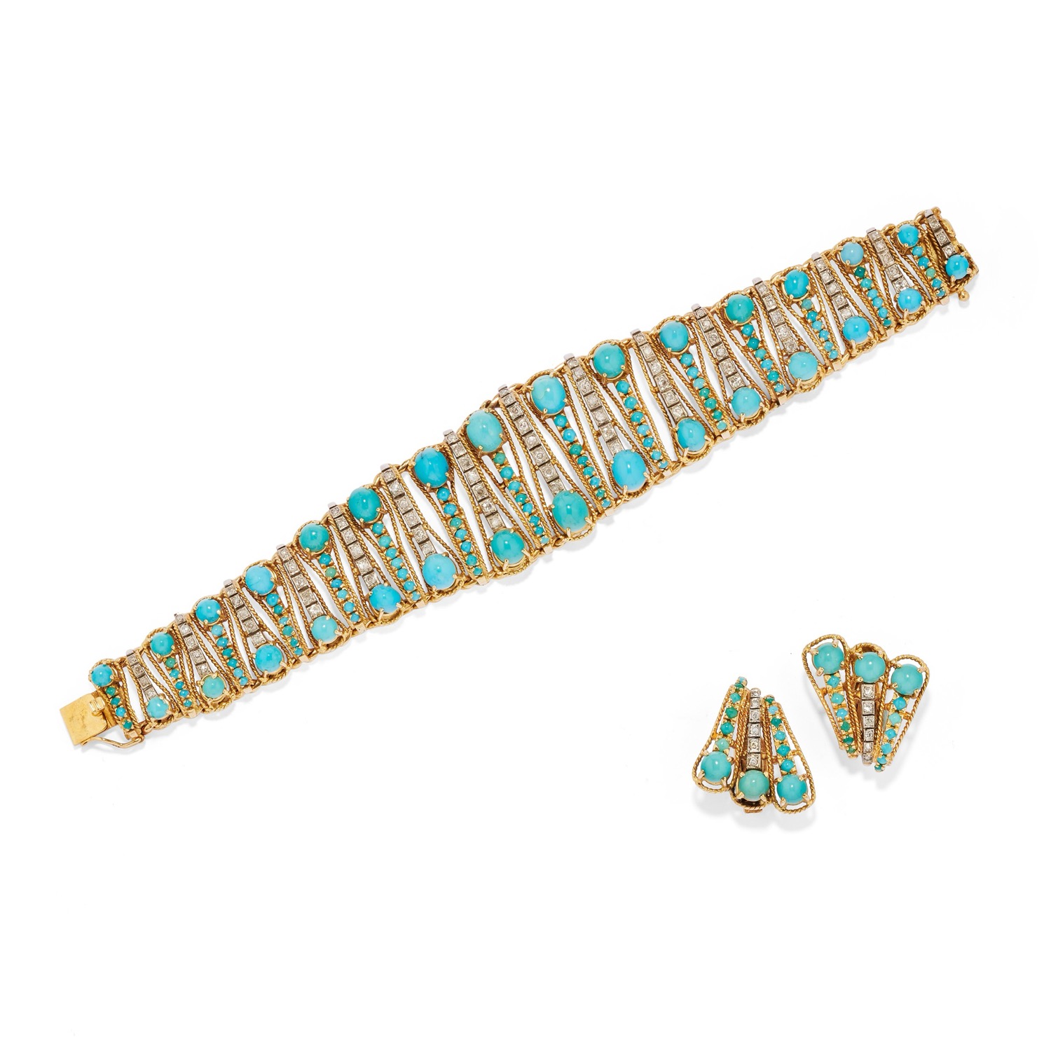 composta da bracciale a settori snodati e orecchini con chiusura a clip decorati con turchesi taglio rotondo cabochon e motivi in diamanti taglio vecchio e huit-huit, difetti (segni d'uso e una maglia del bracciale sganciata).