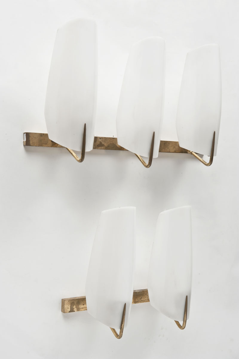 Lotto 254 | Due appliques in ottone con paralume in plexiglass, rispettivamente a due e...