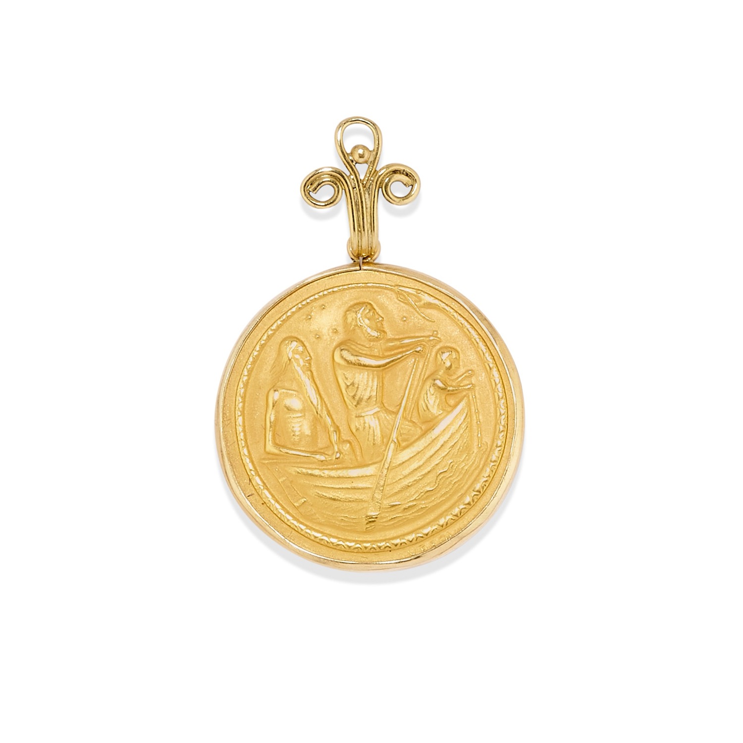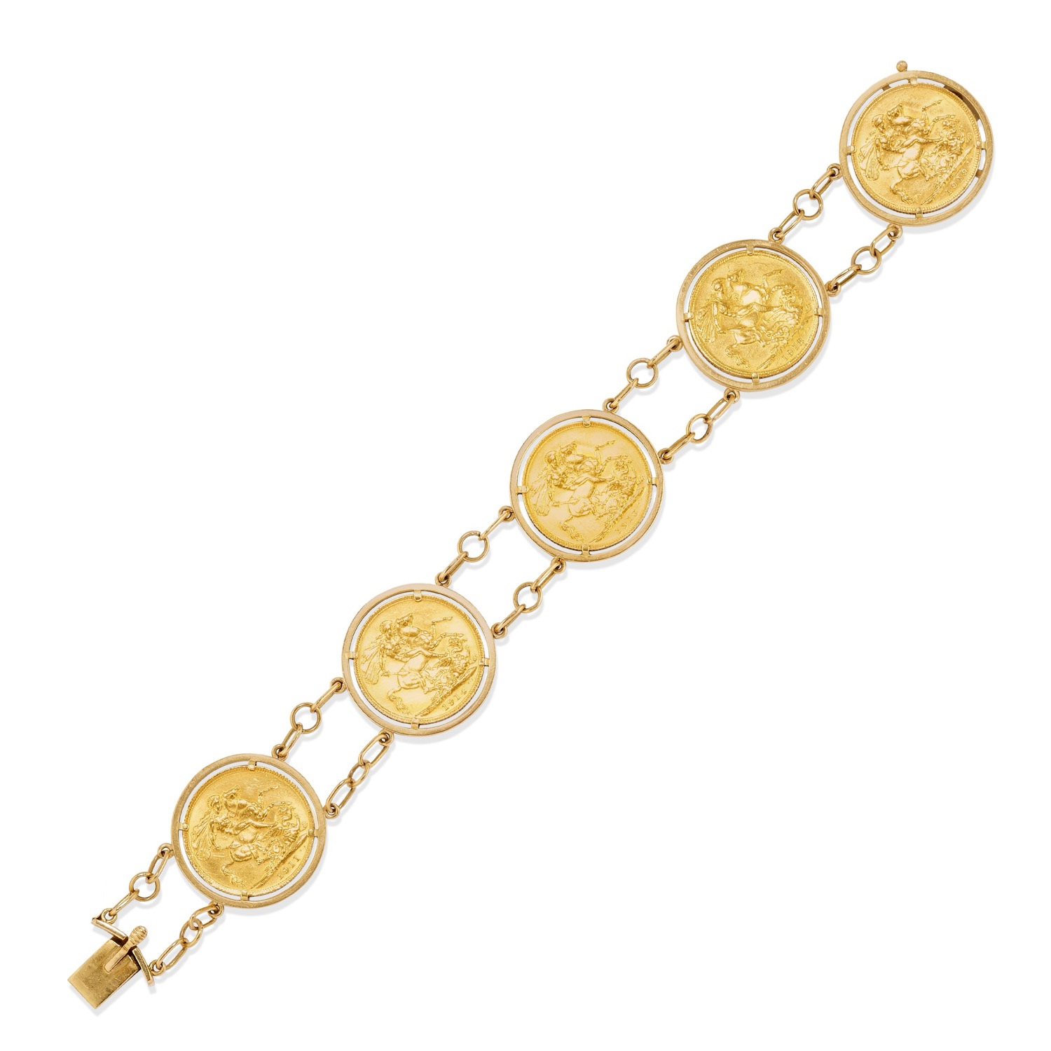 bracciale realizzato con cinque sterline d'oro Giorgio V e pendente con medaglia commemorativa in oro 900.