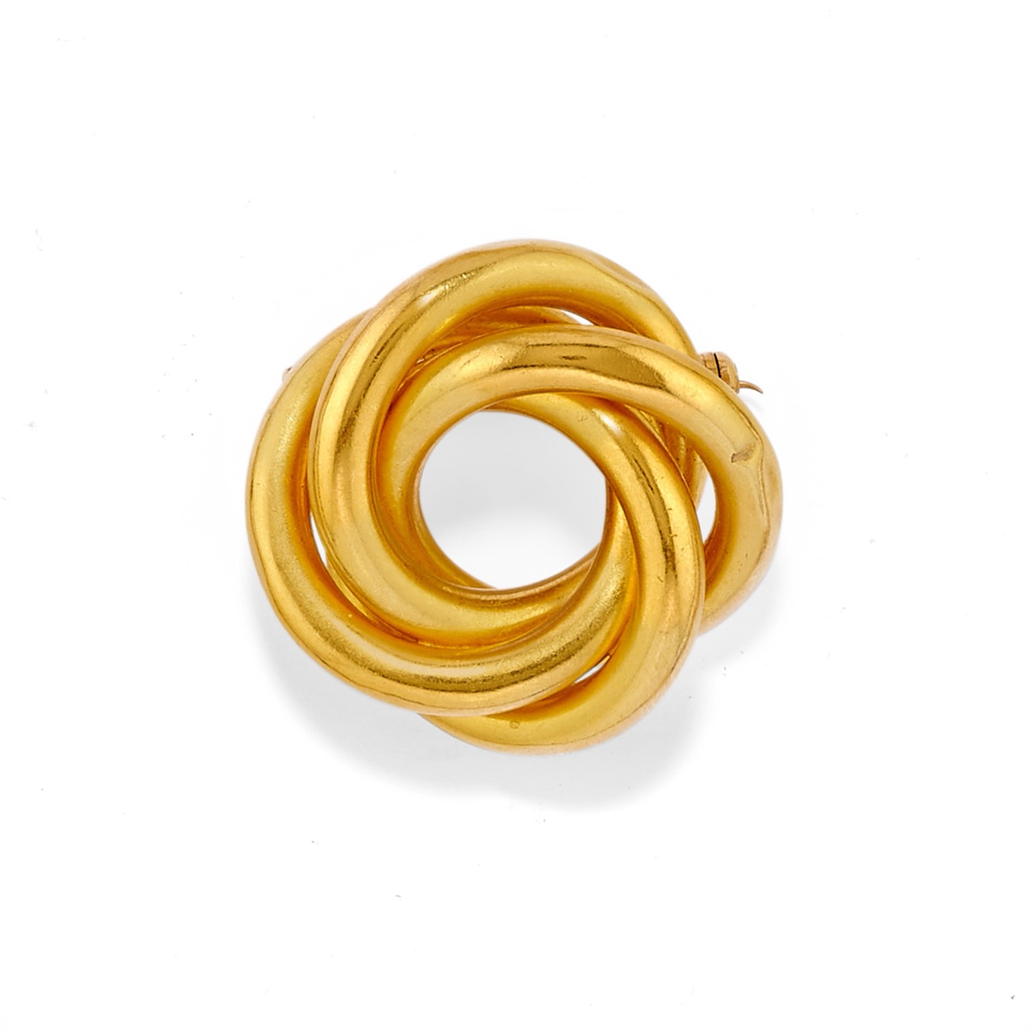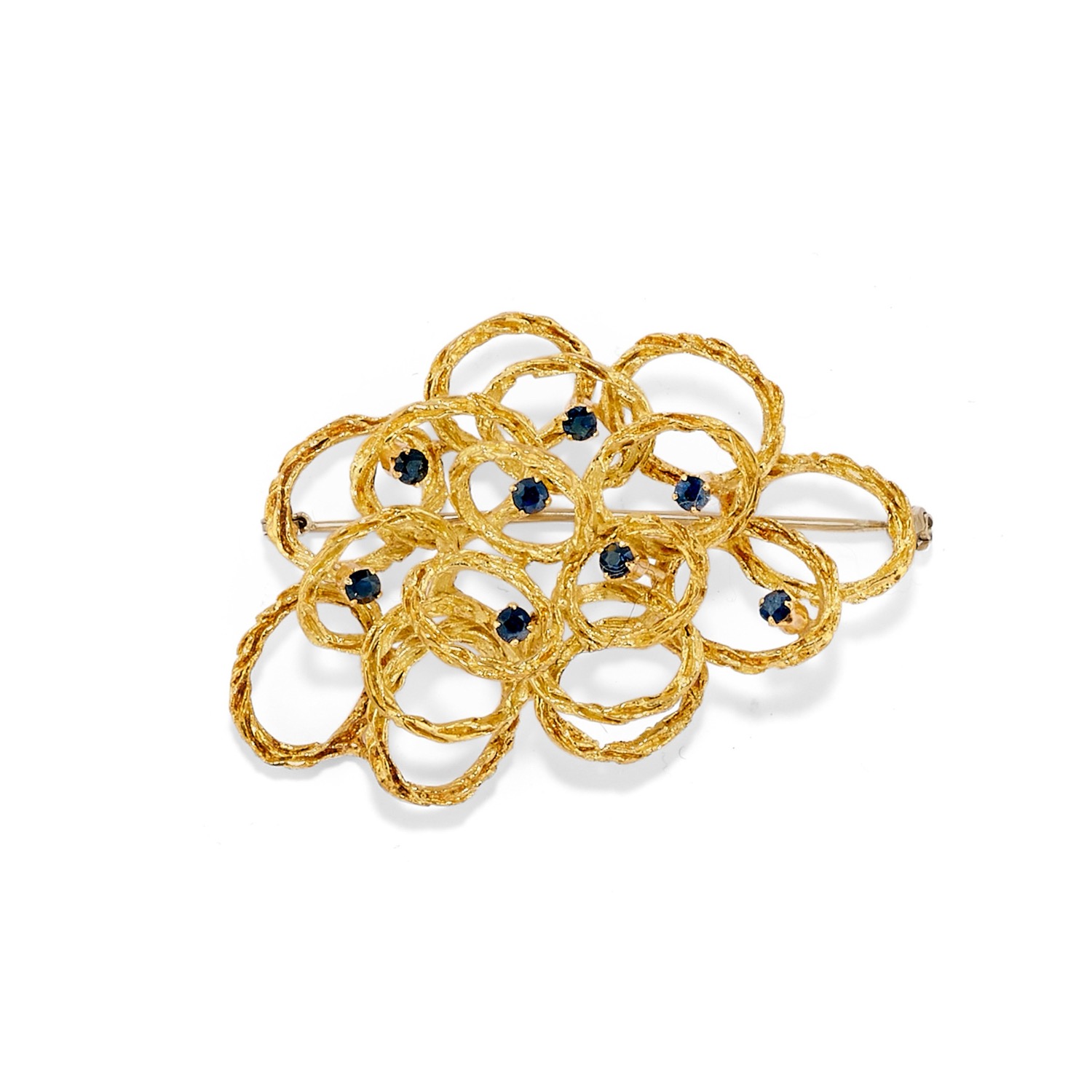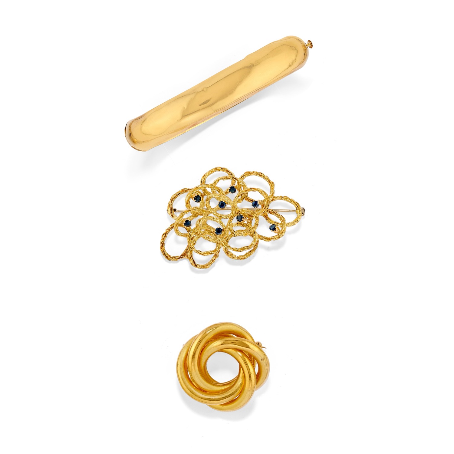 una spilla realizzata in canna vuota con disegno a nodo, l'altra con lavorazione a moduli ovali e zaffiri taglio rotondo e bracciale a mezza cannavuota, difetti (ammaccature).