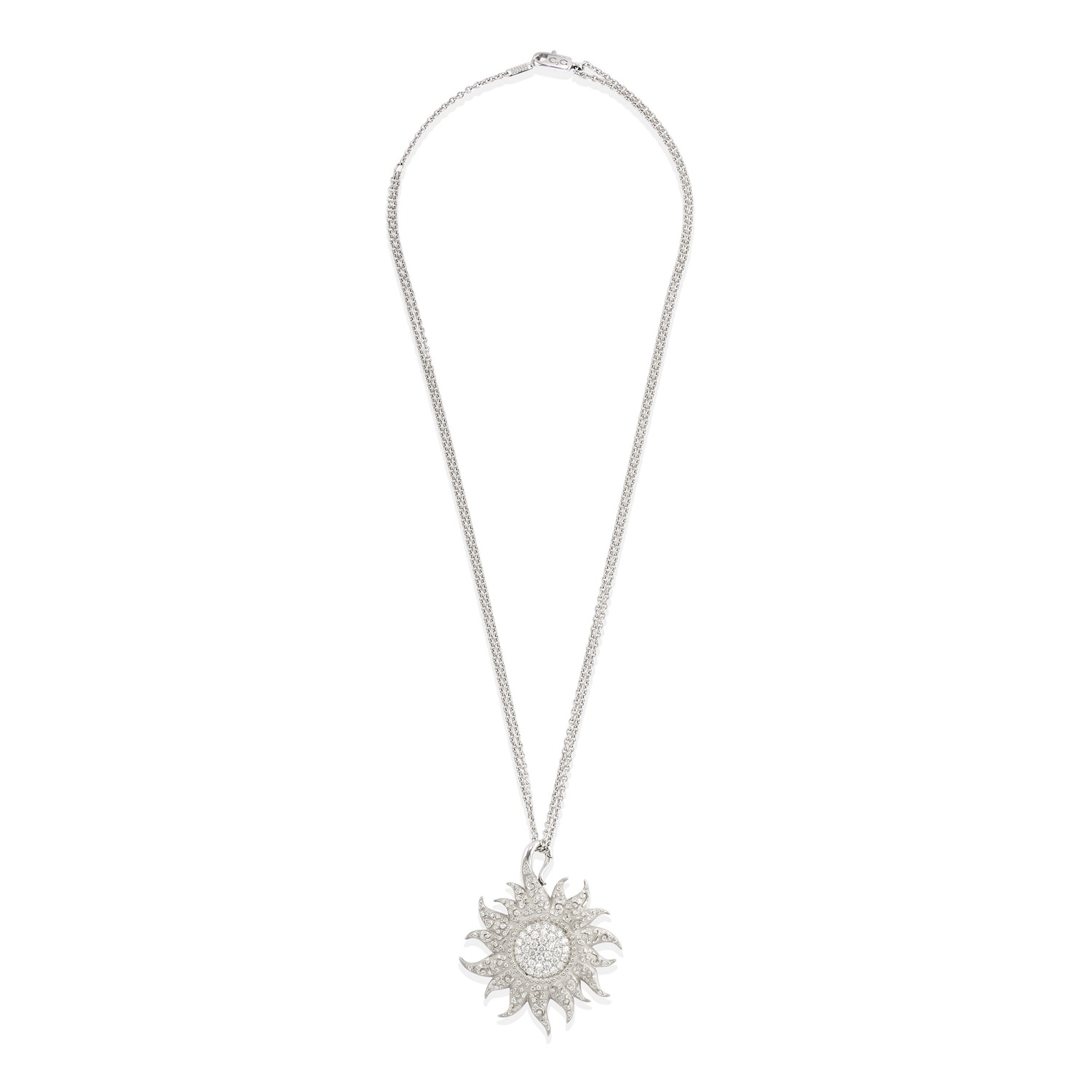 raffigurante sole, satinato e decorato a rilievo con diamanti taglio brillante per totale ct 1,25 circa (prob colore F/G purezza VS1/VS2) con gancio apribile con doppia catena a roleaux.