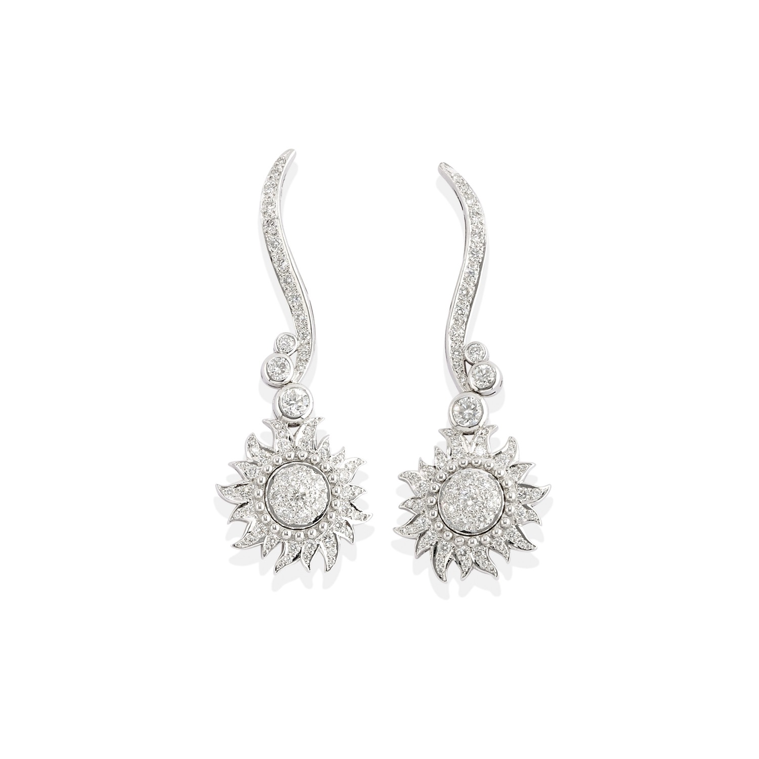 con motivo a sole interamente decorati da diamanti taglio brillante per totale ct 2,32 circa (prob colore F/G purezza VS1/VS2).
