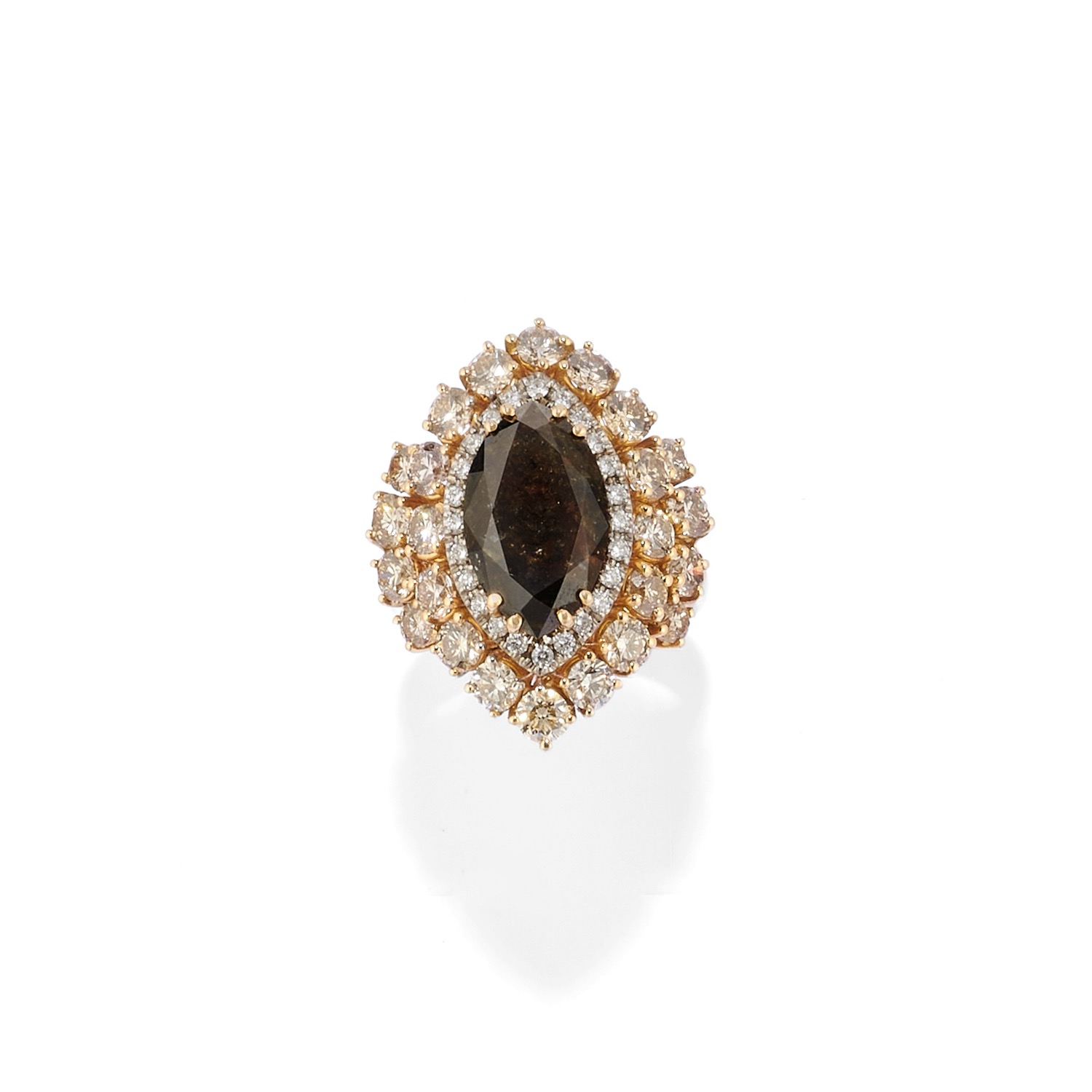 al centro diamante brown taglio marquise di ct 5,90 circa e diamanti taglio brillante per totale ct 3,40 circa.