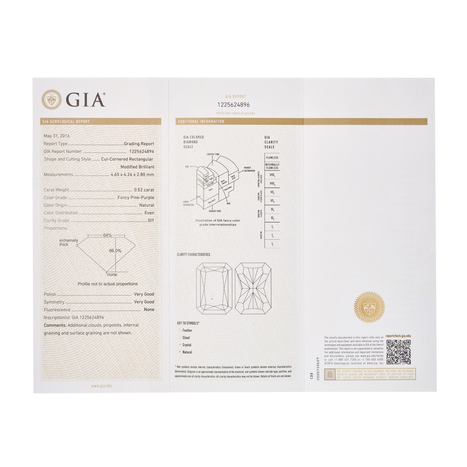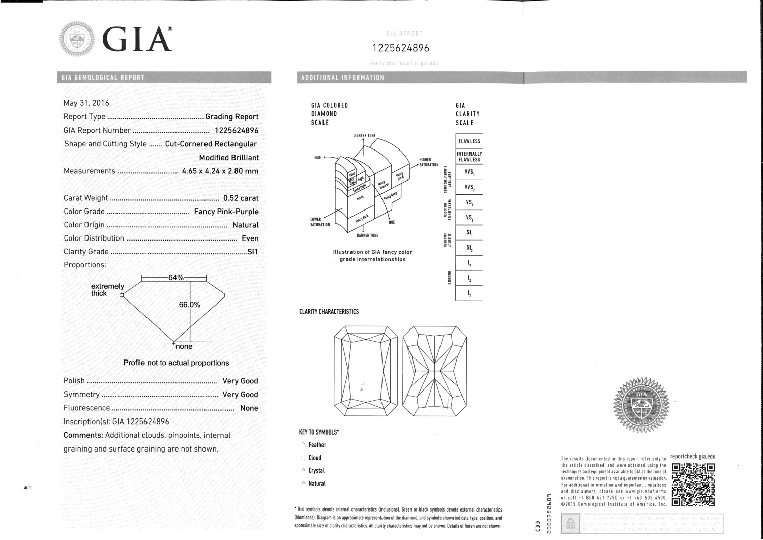 Il diamante fancy pink-purple è accompagnato da certificato gemmologico n. 1225624896 del 31/05/2016, GIA.