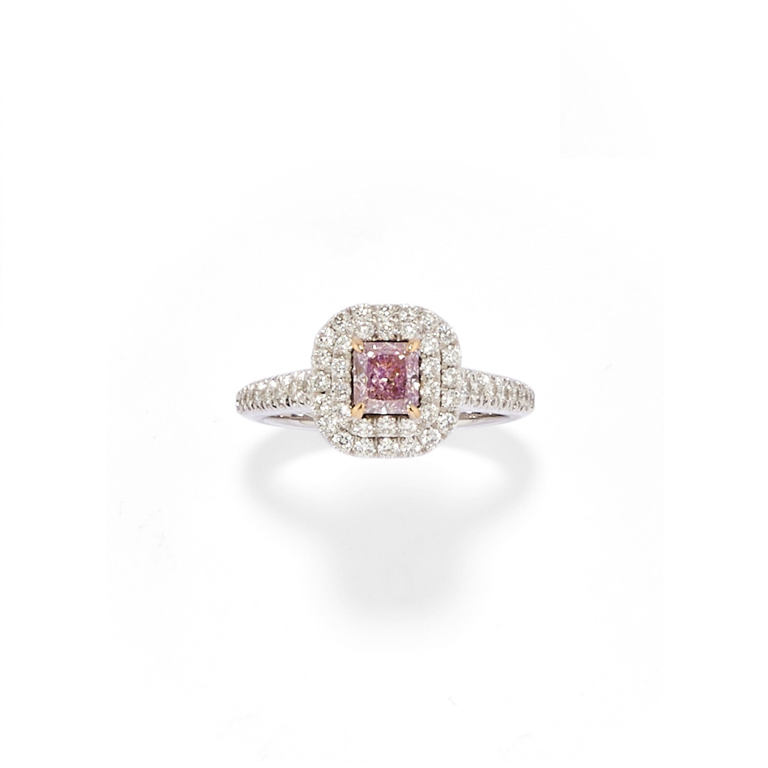 al centro diamante fancy colore pink-purple taglio rettangolare di ct 0,52 (caratura incisa), entro contorno di diamanti taglio brillante, con scatola.