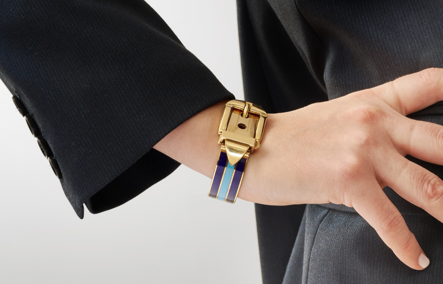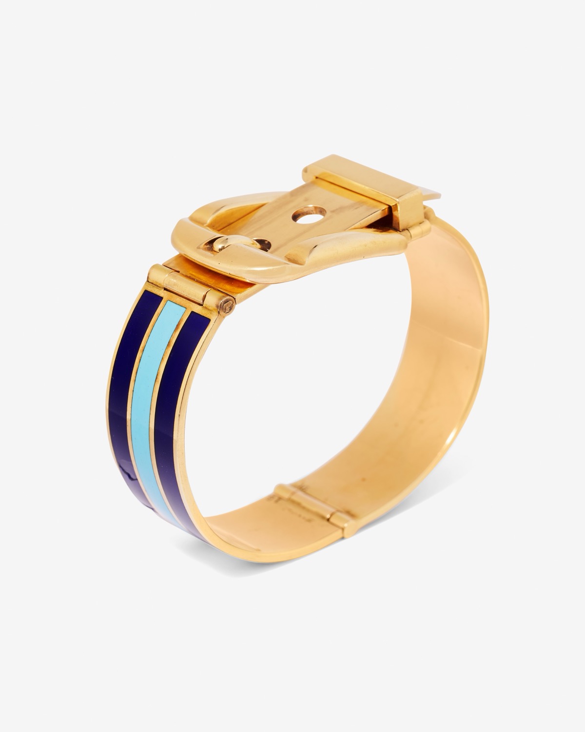 rigido, con smalto nei toni del blu e azzurro, chiusura a fibbia, difetti (lievi sbeccature).