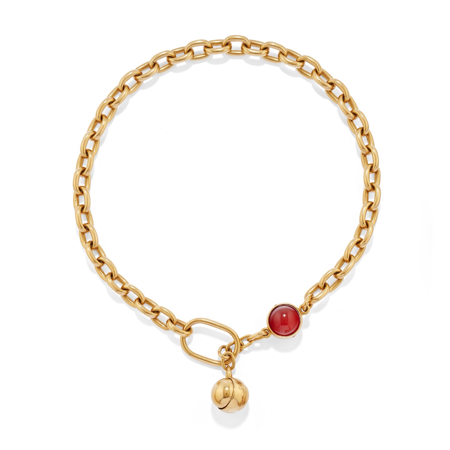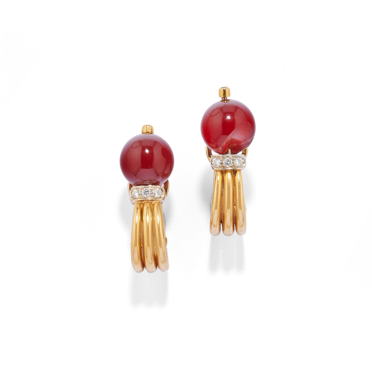 composta da collana e bracciale realizzati con maglie ovali, con boules in corniola e diamanti taglio brillante, chiusura a pressione, e orecchini con chiusura a perno e clip, difetti (un perno mancante e una boule con mancanze).