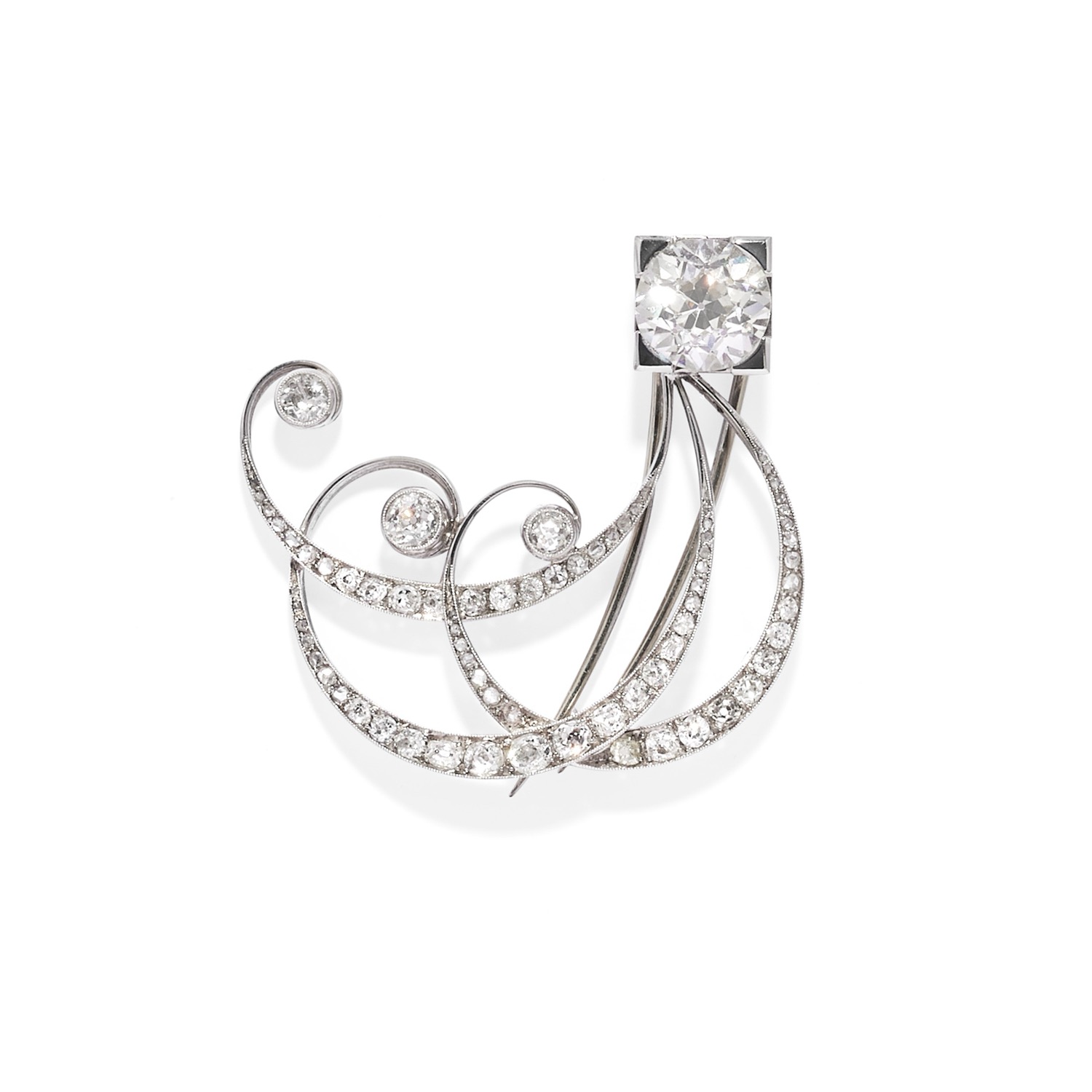 con diamante taglio vecchio di ct 3,80 circa e motivi a volute decorate da diamanti taglio vecchio.