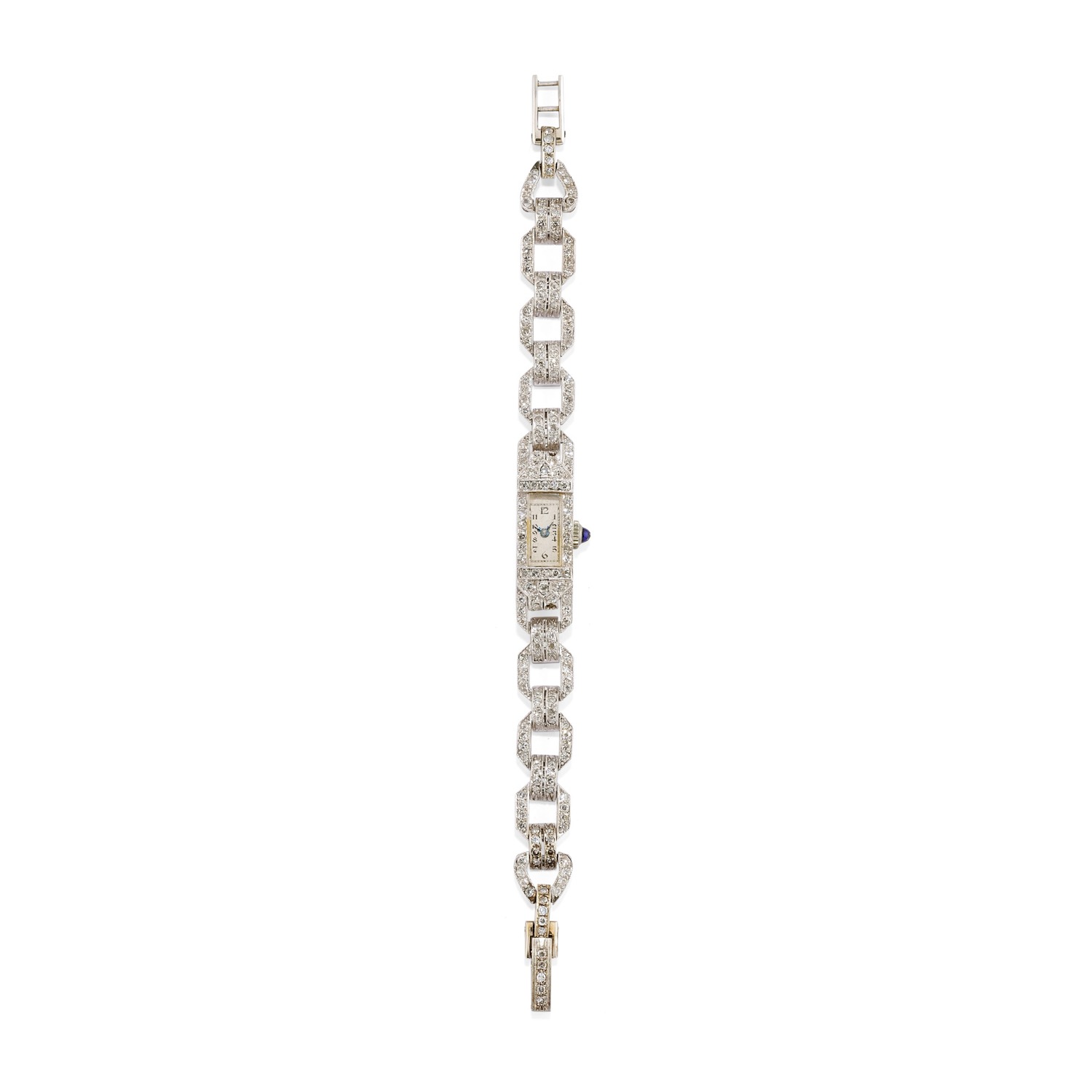 cassa rettangolare (mm 35,00x10,00) settata con diamanti taglio huit-huit, bracciale con diamanti, quadrante (mm 5,50x13,00) color crema con numeri arabi dipinti, movimento a carica manuale, difetti (due diamanti mancanti).