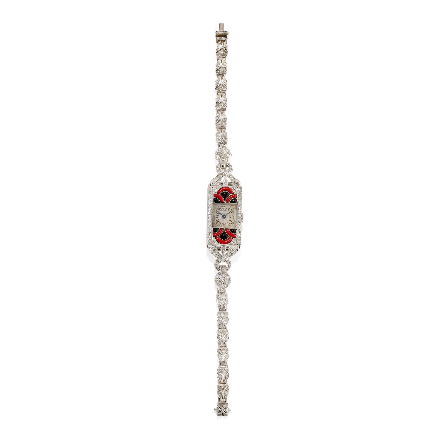 cassa rettangolare (mm 27,00x15,00) con decoro a spiga sui profili settata con diamanti taglio huit-huit, inserti in onice e corallo, bracciale con diamanti, quadrante (mm 11,00x11,00) color crema con finitura guillochè, numeri arabi dipinti art Decò, movimento a carica manuale, punzoni francesi.